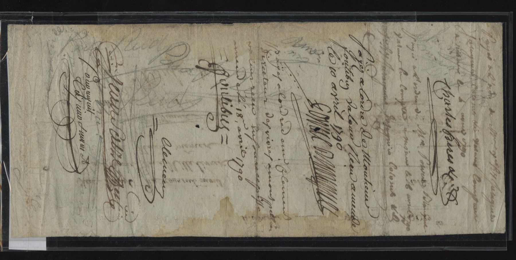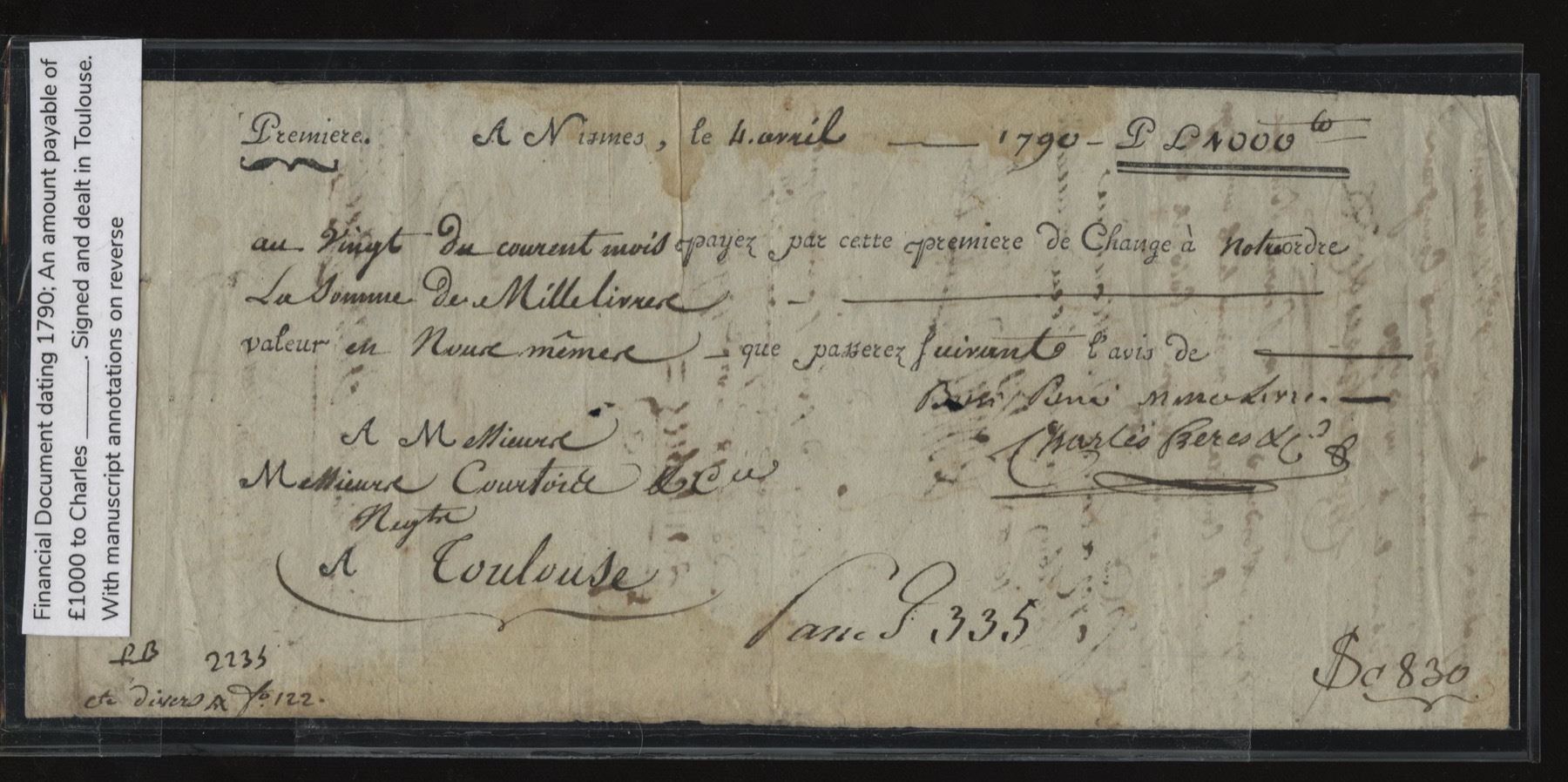 A 1790 French first bill of exchange for L 1000 signed at Toulouse. There are several notes scribbled on the reverse but nevertheless an interesting document.