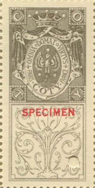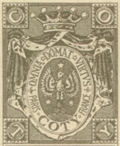 François Coty took the elegant and bold design of an eagle holding three balls in his talons, enscribed in an oval with latin inscription "omnia domat virtus" (virtue conquers all things), resting under a crown; he used it on his legendary masterpiece, Chypre.