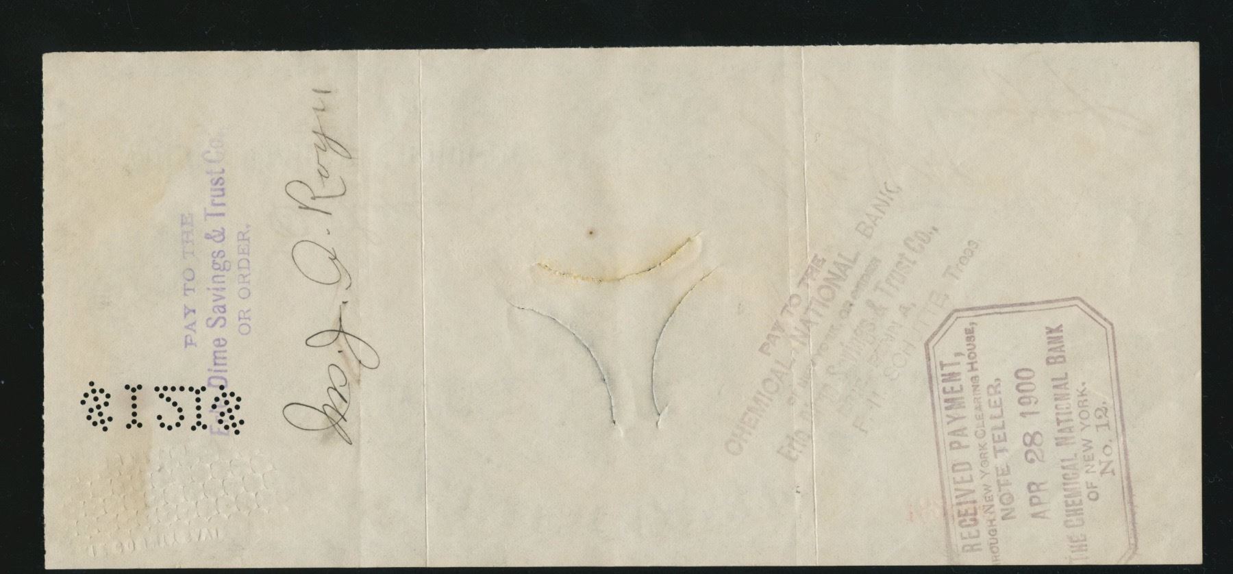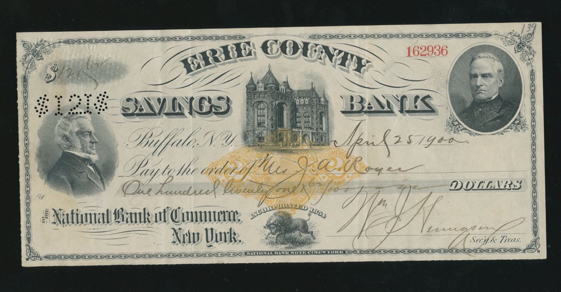 Draft dated April 25, 1900, ornate document, view of bank and portraits of bank officers.
