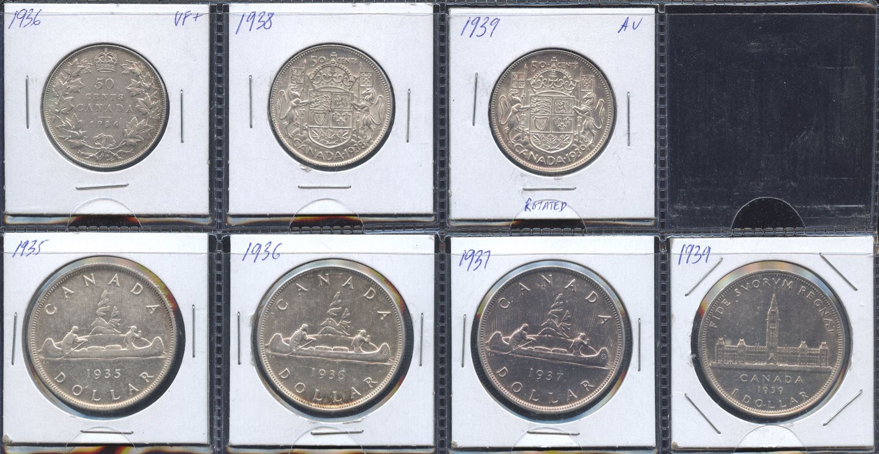 Dates includes: 1936, 1938, 1939 Fifty Cents and 1935, 1936, 1937, 1939 Silver Dollars. Conditions are decent and worth inspecting. 7 Pcs.