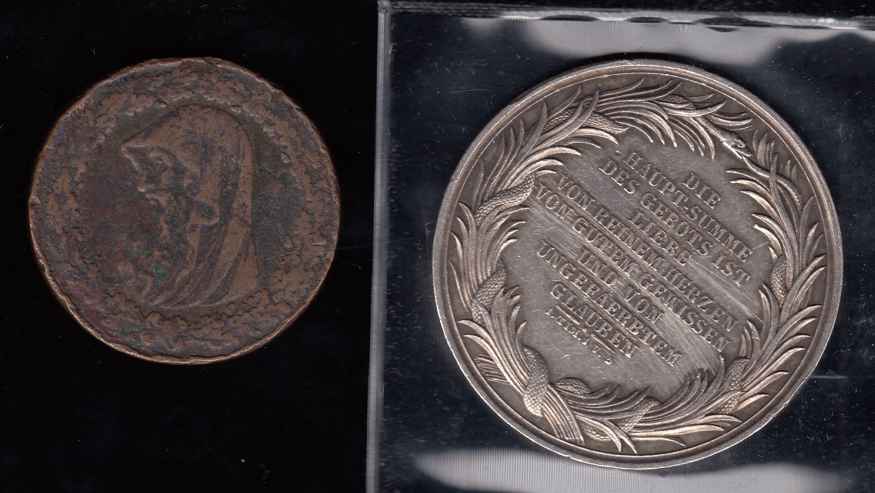 Great Britain Conder Anglesey Mines 1787 to 1797 ONE PENNY token — These tokens were minted in penny and half penny denominations, and came with various patterns. The definitive feature is the Druid head on the front. Monograms ll the back of most coins. These coins were payable in London, Liverpool, or Anglesey. The Anglesey Mining Company is still in operation today. They have a big facility at Parys Mountain in Wales and the PMC monogram indicates that the pictured coin was issued by the Parys Mountain Company to pay its workers and for general circulation as well; AND Austria / Germany 1800s 32mm medallion- SELIG SIND DIE GOTTEWORT HOEREN UND BEWAHREN LUC. II V. 28 (Blessed are the gospel hearers, and preserve luc. II v. 28) / DIE HAUPT-SUMME DES GEBOTS IST DIEBE VON REINEMHERZEN VON GUTEMGEWISSEN UND VON UNGEPAEBBIEM GLAUBEN (The main sum of the commandment is the thief of pure heart of good faith and of unpopularity.)