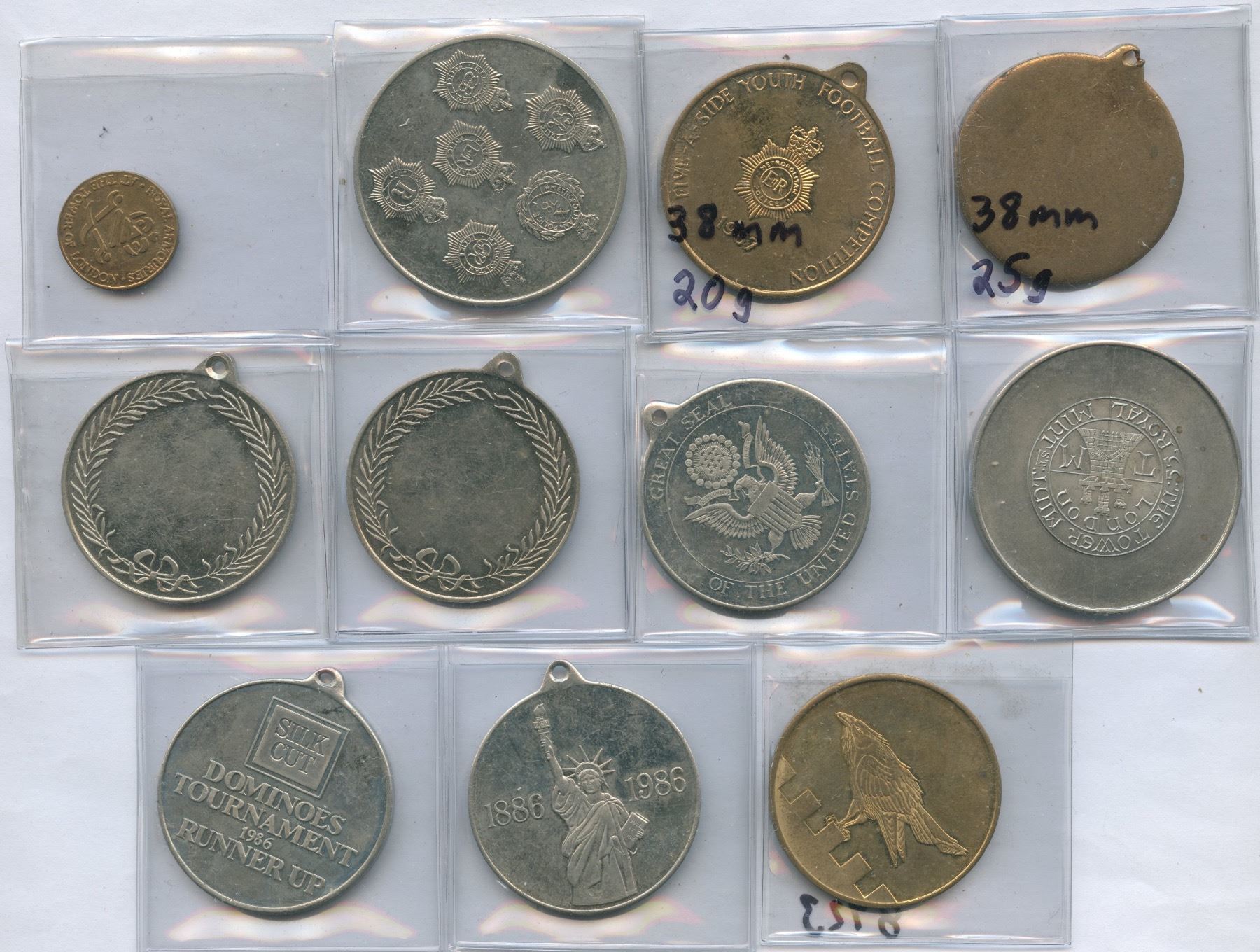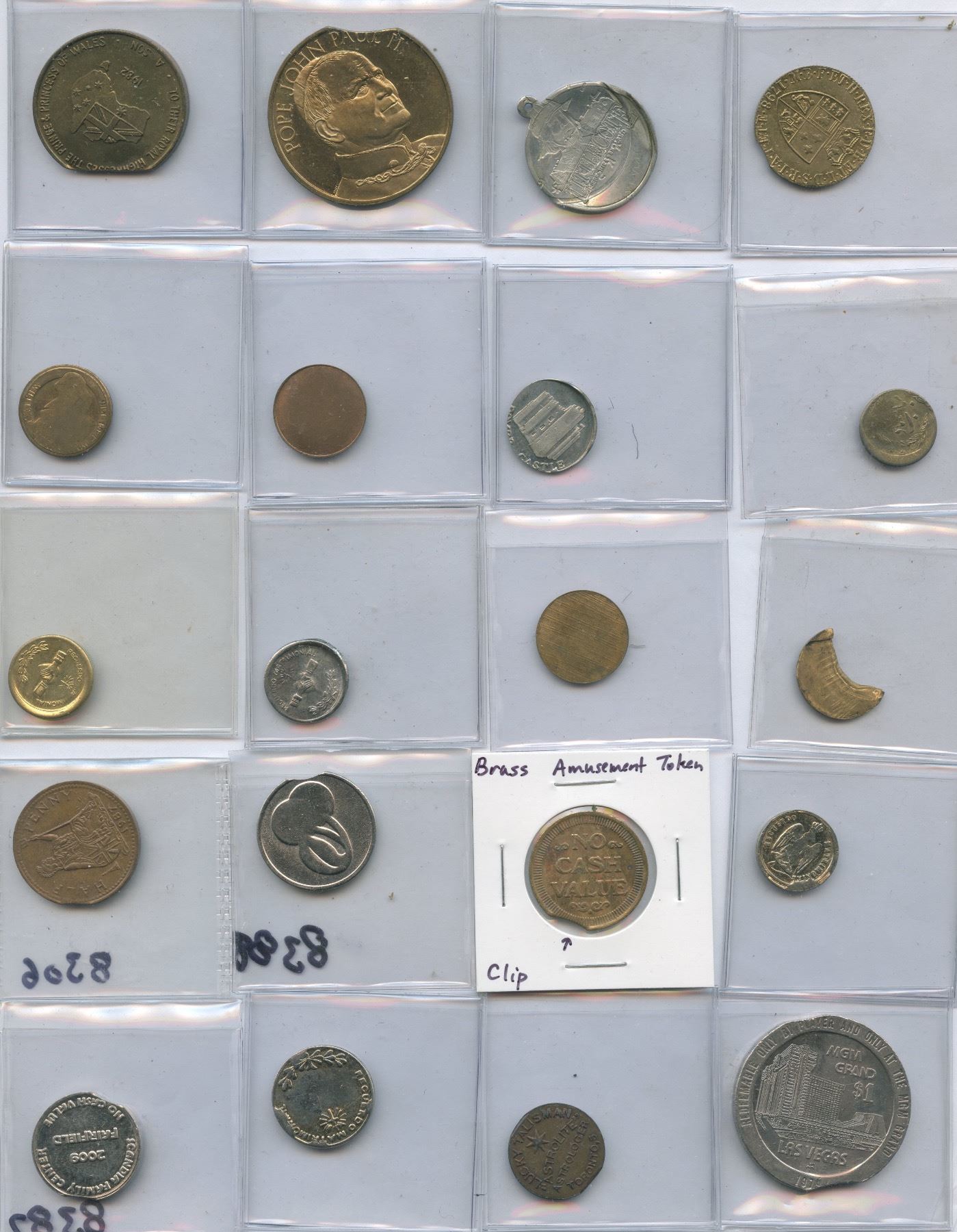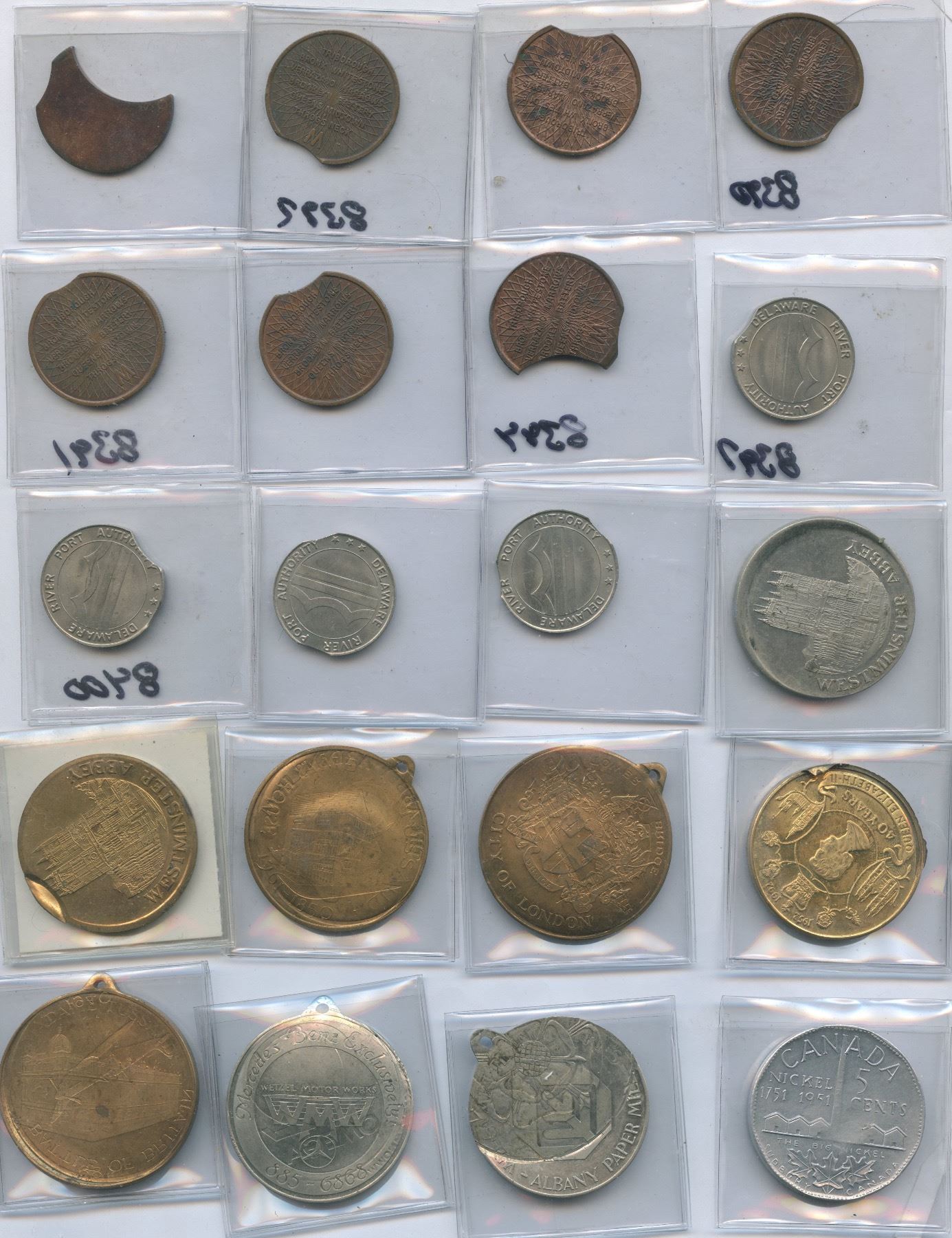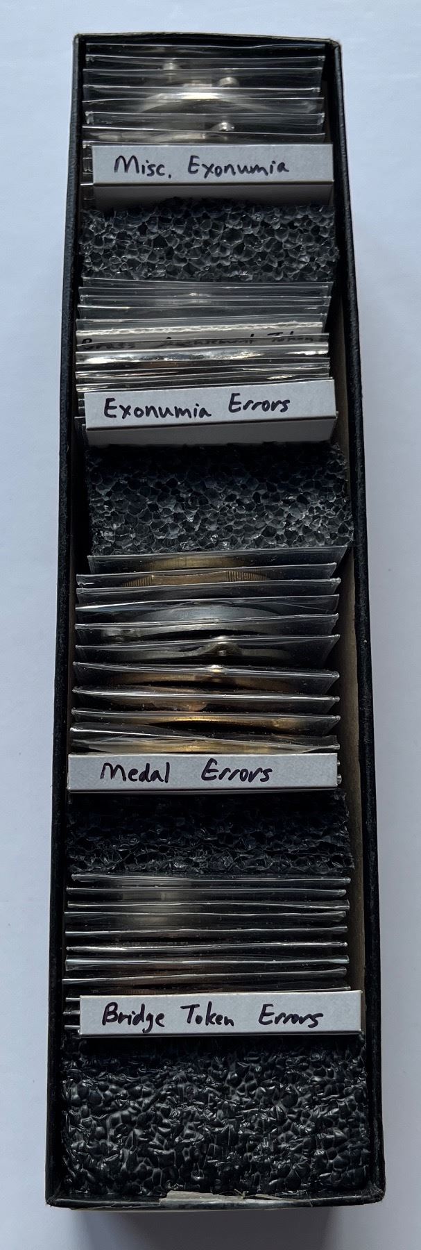 Single row box with a collection of bridge token errors, medal errors, exonumia errors, and some misc. exonumia, likely reference pieces, 51 pieces. Patrick Glassford Collection.