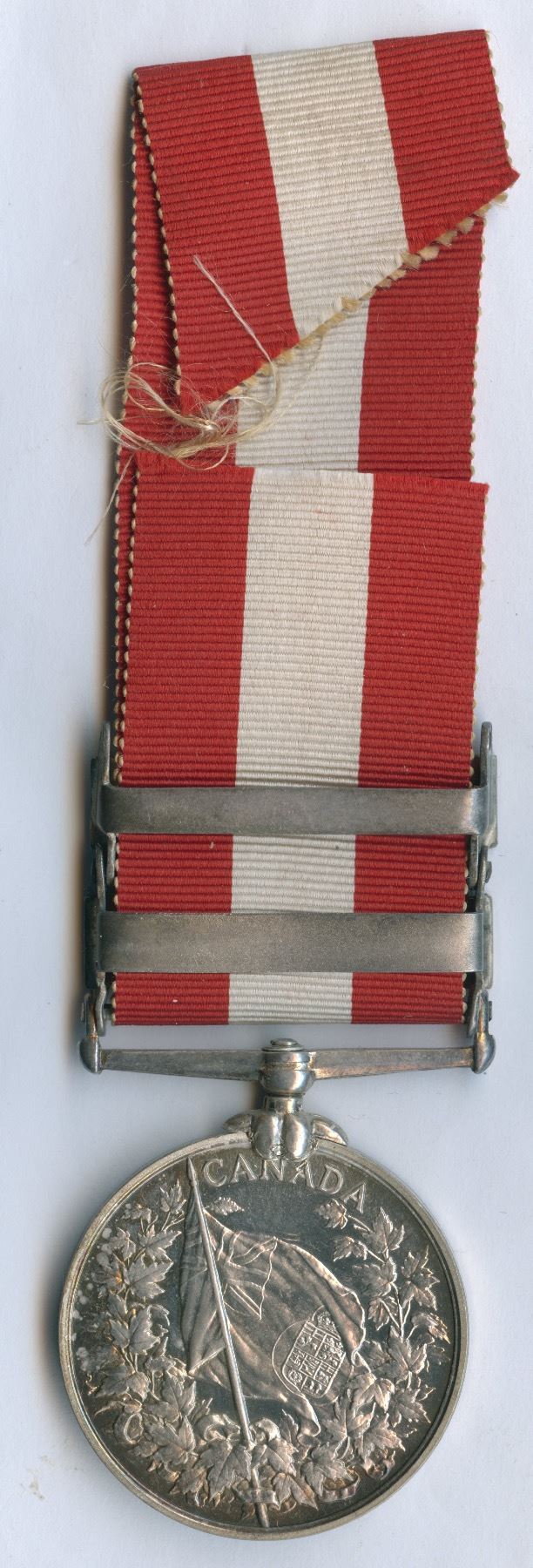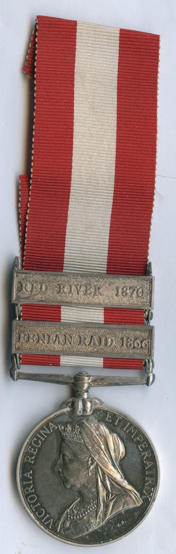 Instituted 7th January 1899 and granted to all officers, non-commissioned officers, and men of the regular and colonial forces who were employed in repelling the Fenian raids on the Canadian frontier in 1866 and 1870 or who were engaged in the Red River Expedition of 1870. 36mm diameter in silver, with a swivelling suspension. Obverse; the veiled, diademed bust of Queen Victoria and the Legend ' VICTORIA REGINA ET IMPERATRIX'. Reverse depicts the old Canadian ensign within a wreath of maple with 'CANADA' above. Unnamed with 2 clasps.