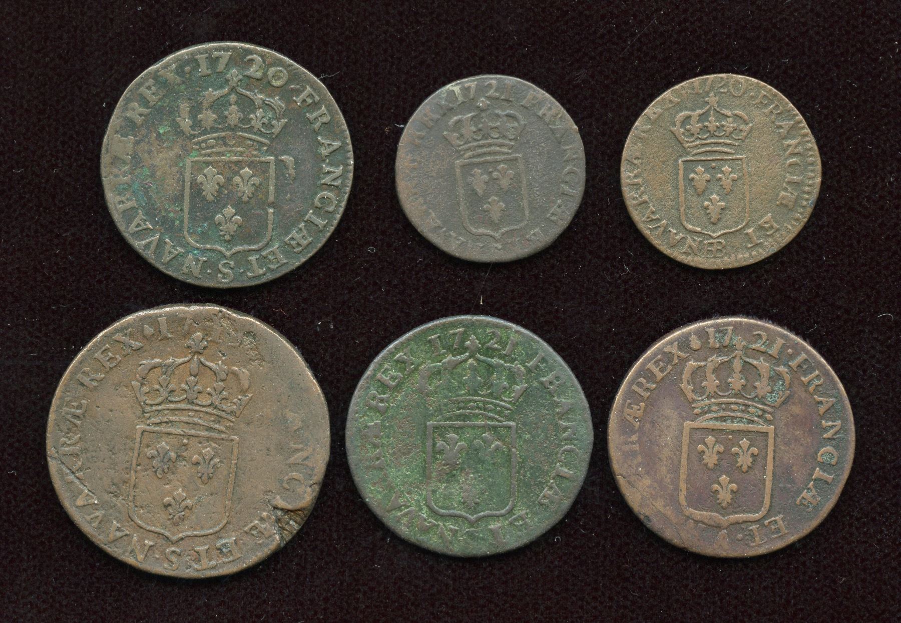 Liard or 3 Denier 1720BB; 1721S; Demi Sol 1720S; 1721A; 1721S; Sols 1719S. F-VF. 6 Pcs.