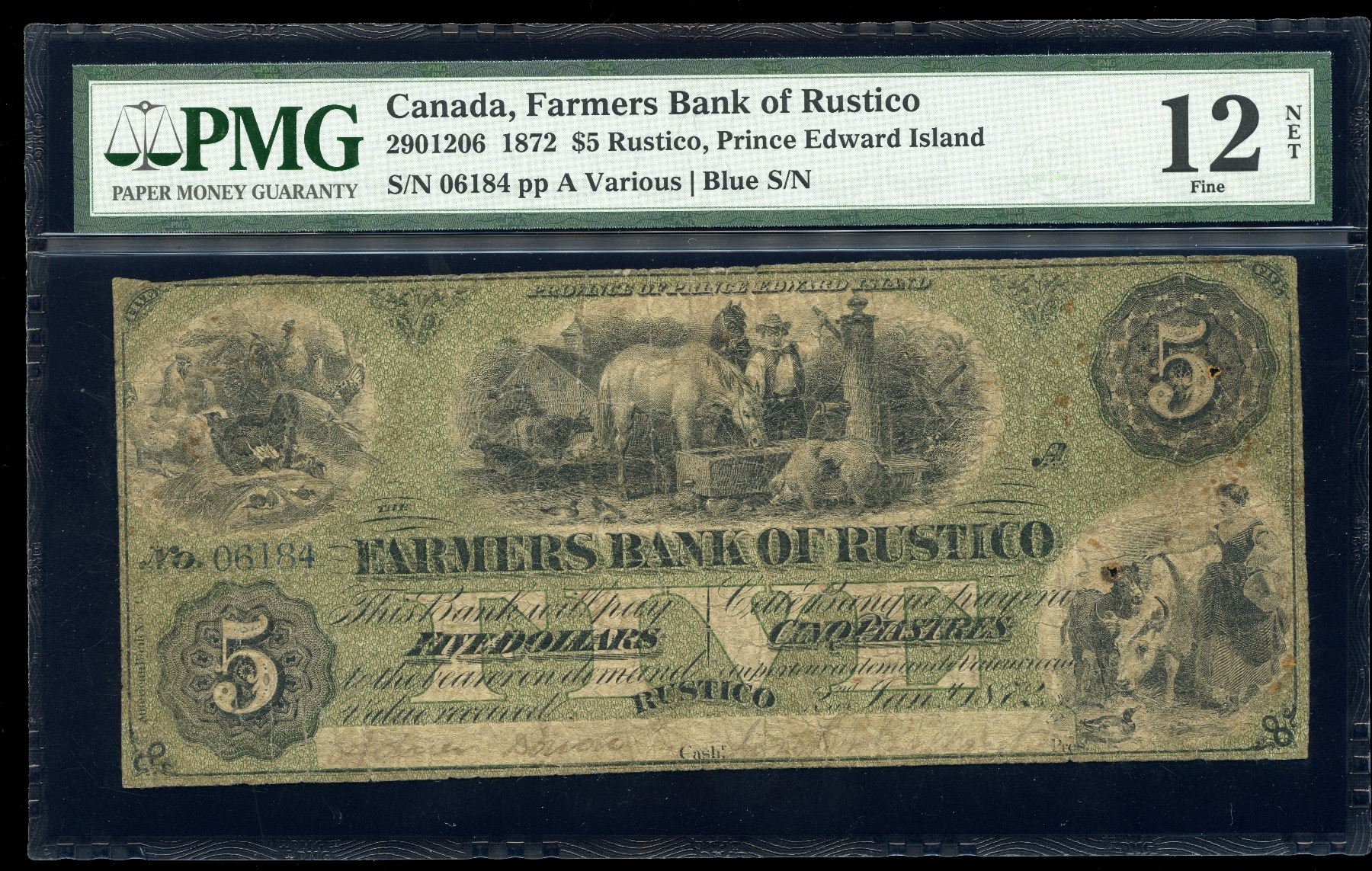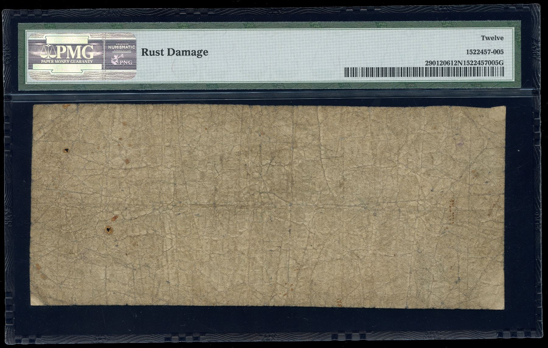 CH 290-12-06, PMG Fine 12, rust and hole damage at right, only 6 on the registry 1 of which is in the institutional collection. S/N:06184/A.