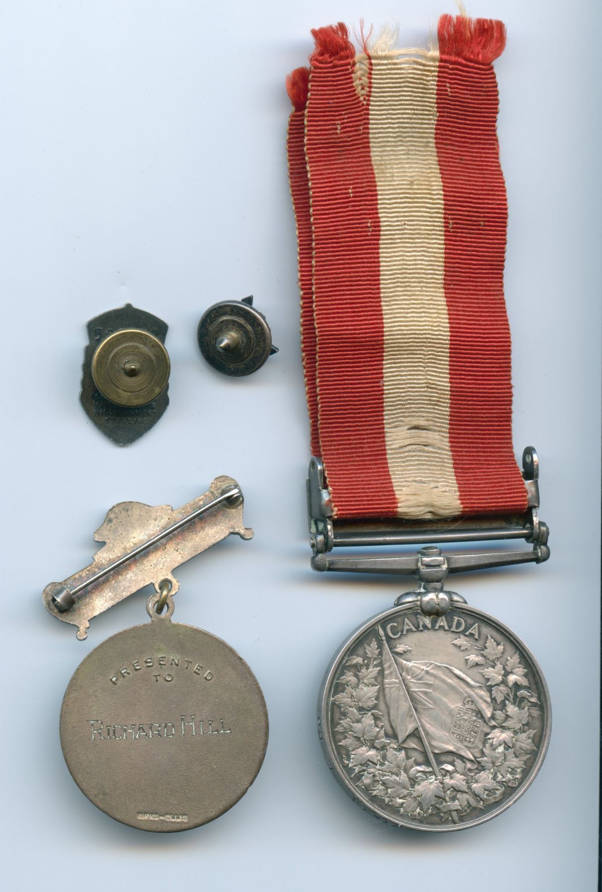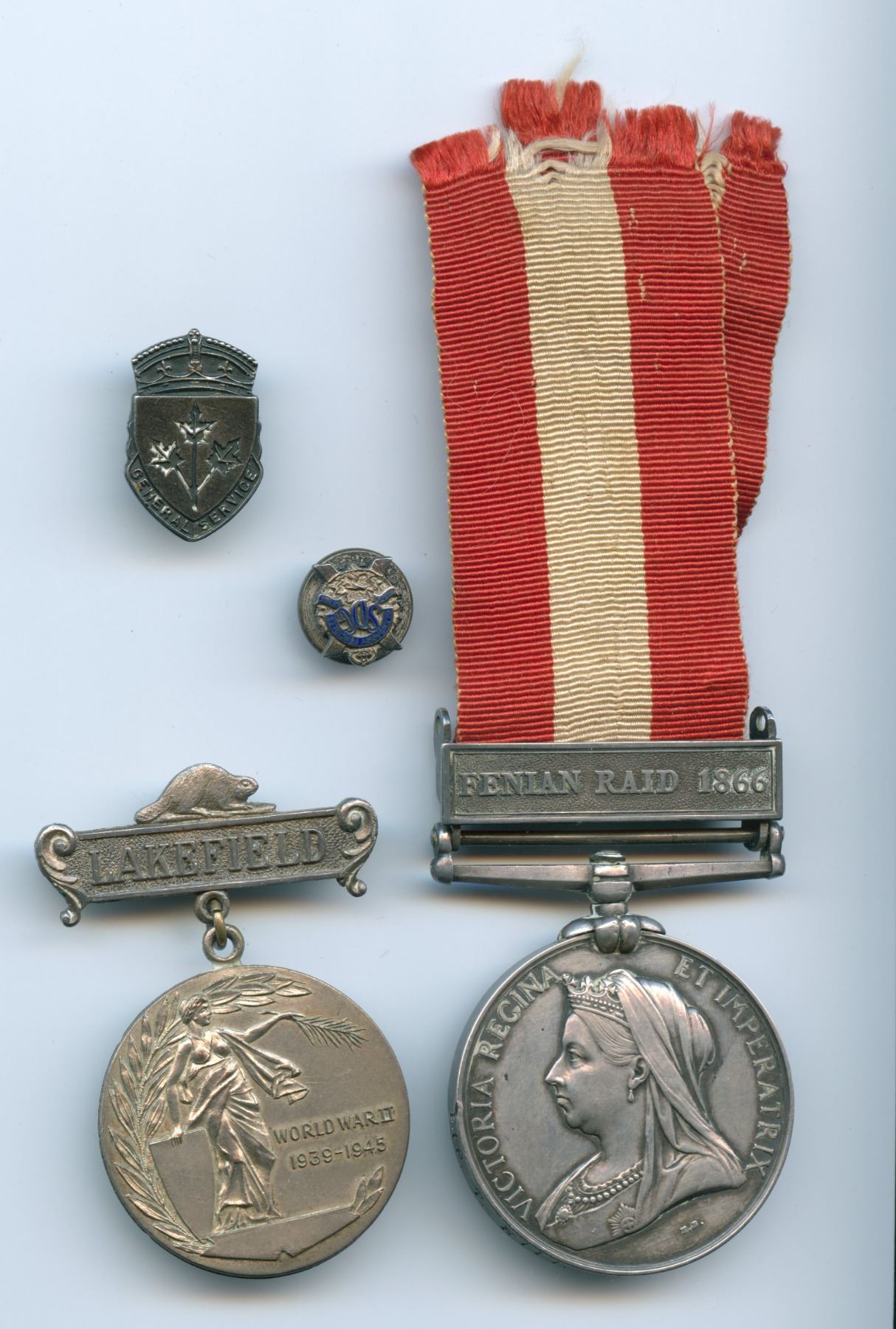 1866 Fenian Raid Medal awarded to Pte. T. Hill Lakefield Infantry Co. WWII Homefront Medal Presented to: Richard Hill. General Service Pin, WWII Glengarry Fencibles Sweetheart Pin. 4 pcs.