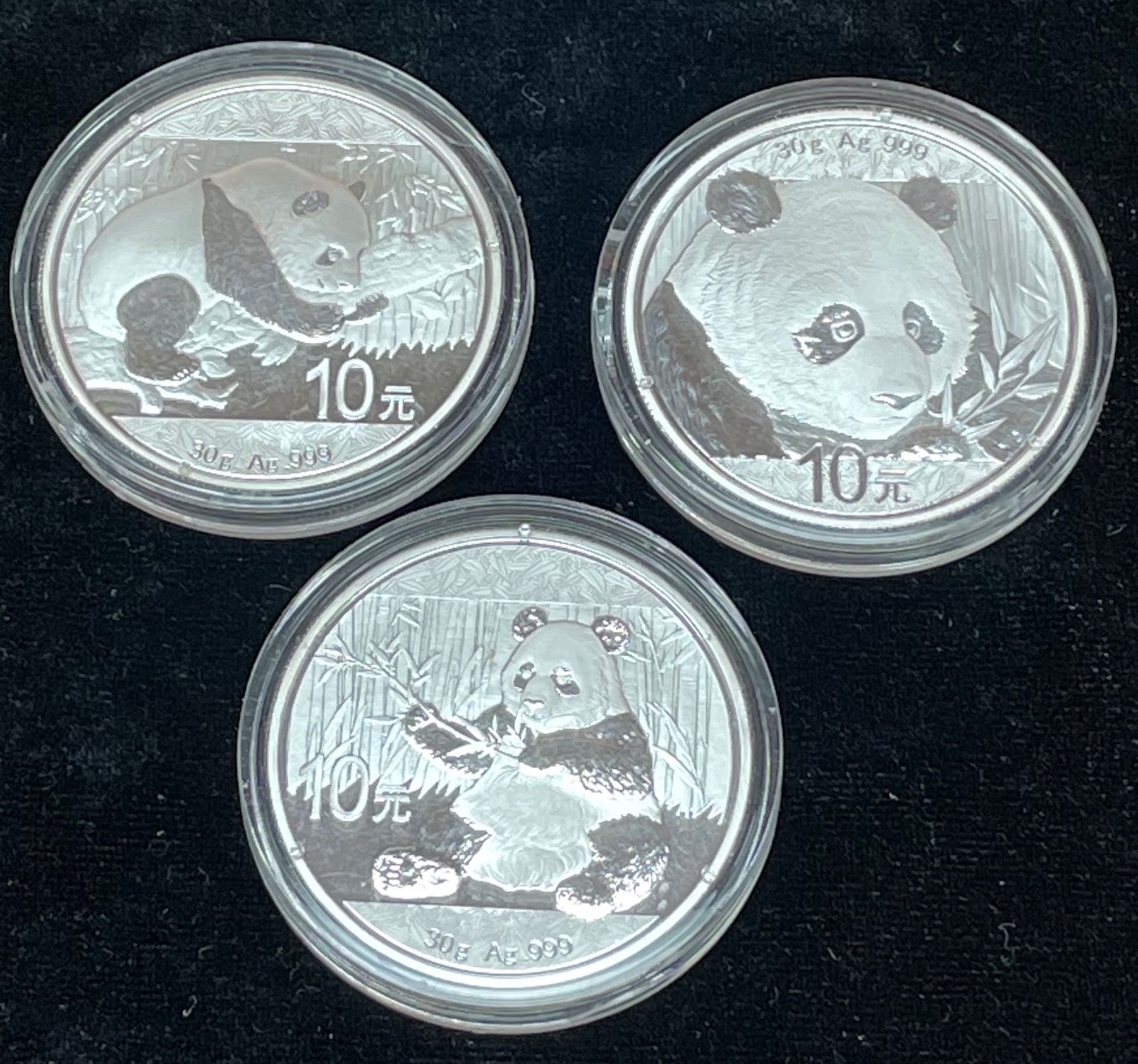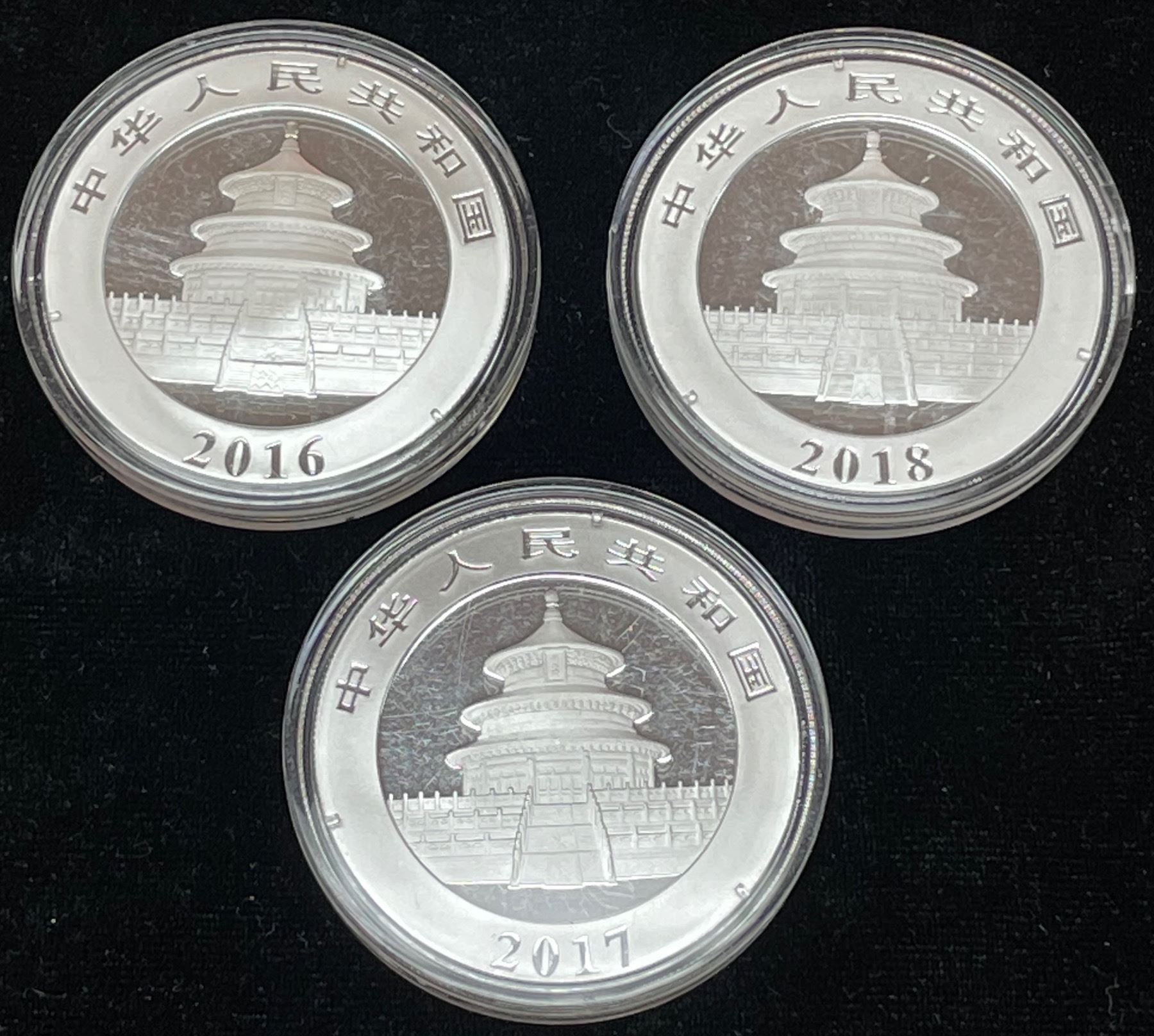 These coins are highly sought after, China fine silver panda 10 yuan coins from 2016, 2017 and 2018. All uncirculated in sealed capsules.