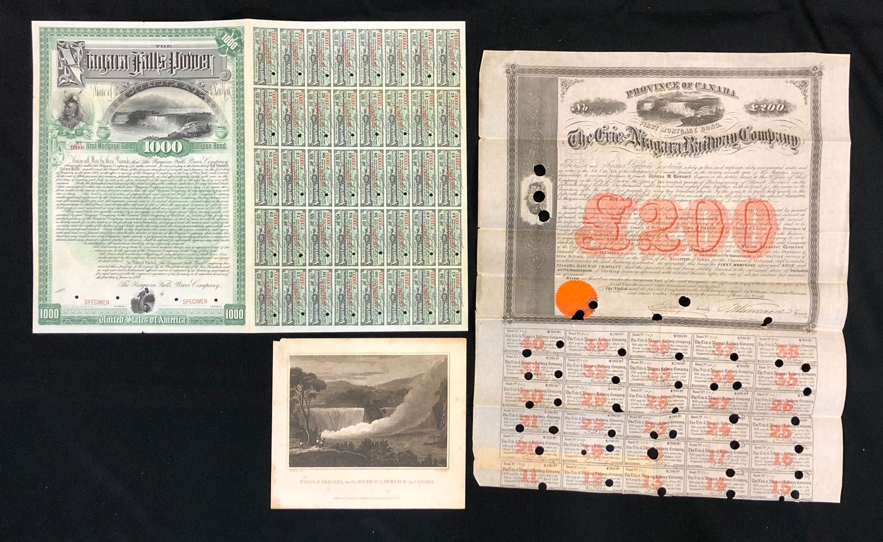 First Mortgage $1000 Bond, Niagara Falls Power, a Specimen. Printed in black with green tint by ABNCo., dated 1892. Three vignettes, including Indian brave (1888 Ontario Bank $5), arm and hammer, "Muscle" (1872 Bank of Acadia $5 and others), and a large engraving of Niagara Falls. A rare and attractive item. Also, Erie & Niagara First Mortgage Bond, £200, 1864, with Niagara Falls vignette, thirty interest coupons attached, each cancelled with a hole. Finally, an 1804 engraving, T. Wallis, "Falls of Niagara, on the River St. Lawrence in Canada", with light foxing. Total of three items.