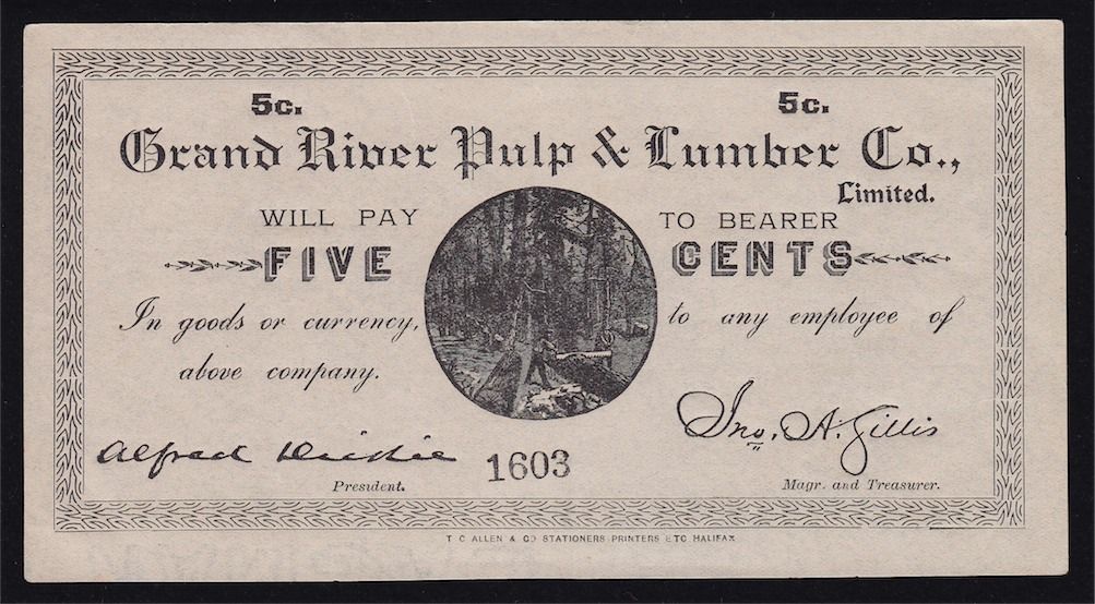 Five Cent Grand River Pulp & Lumber Co - CH NL-30-10 Unlisted in Charlton Canadian Merchant Scrip Catalogue. The vignette on these scrip features a lumber cutting scene. The company was owned by Nova Scotian investors. It is believed this scrip was printed by T.C. Allen & Co. Stationers Printers of Halifax. Issued to the company's workers in the early 1900's. The scrip was redeemable in goods or currency. AU/UNC with lots of embossing. S/N:1603.