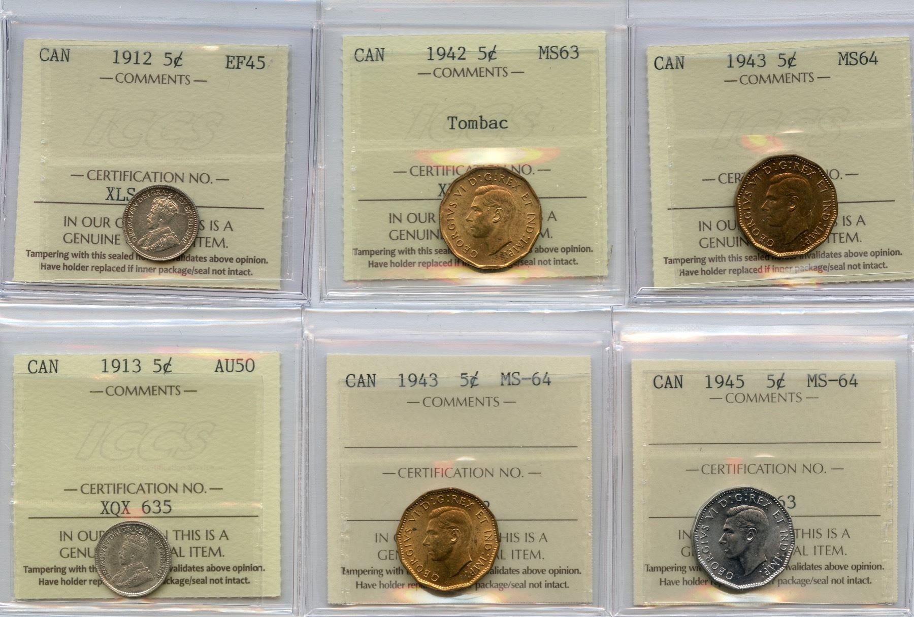 Includes: 1912 EF-45. 1913 AU-50. 1942 Tombac MS-63. 2 x 1943 Tombac MS-64. 1945 MS-64. 6 pcs.