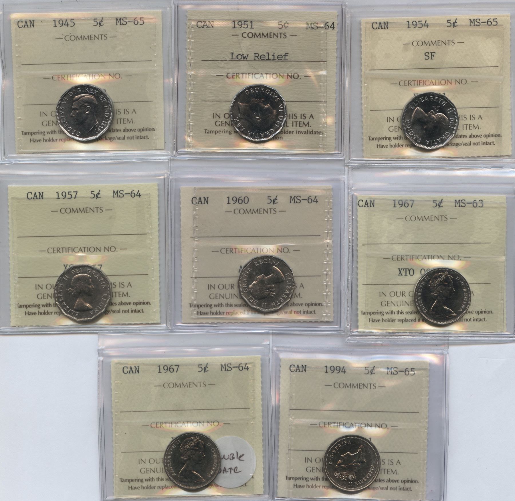 Includes: 1945 MS-65. 1951 MS-64, low relief. 1954 MS-65, SF. 1957 MS-64. 1967 MS-64, doubling on the date. 1967 MS-63. 1994 MS-65. 1960 MS-64. 8 pcs.