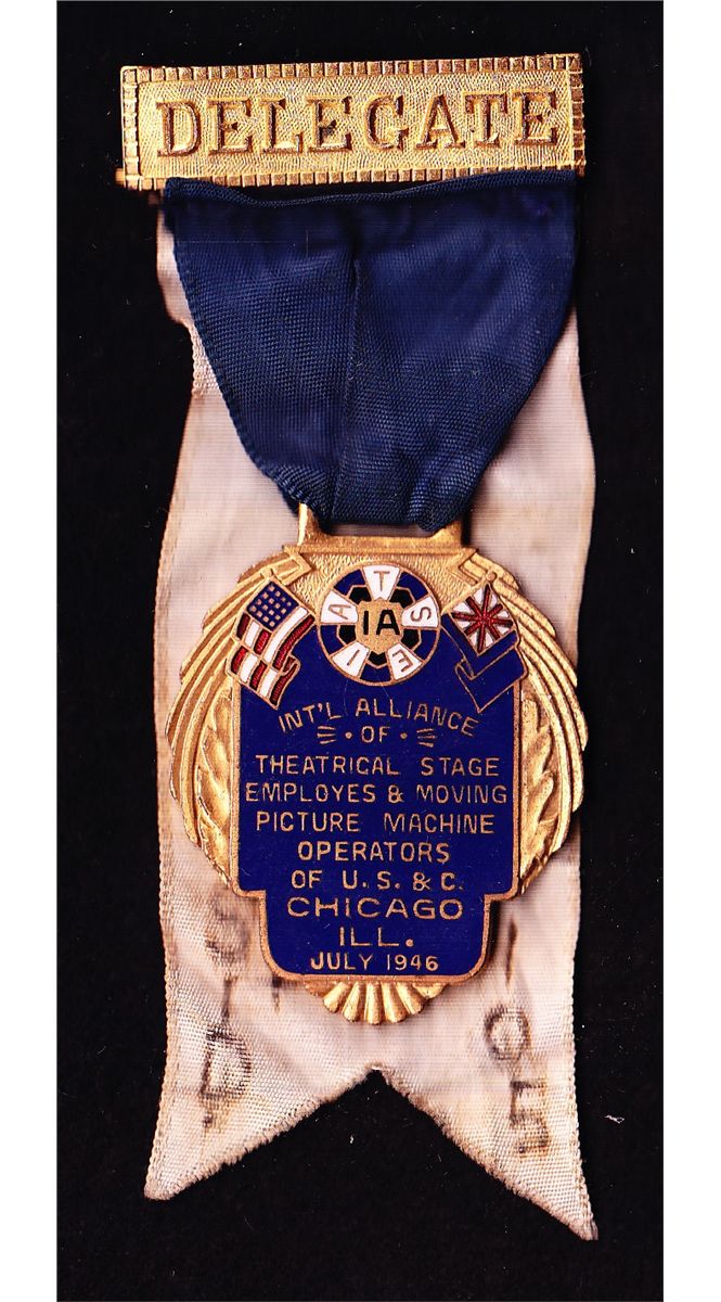 Foreign Medal - International Alliance of Theatrical Stage & Employees & Moving Picture Machine Operators of US & C., Chicago, ILL., July, 1946, blue enamel, delegate badge, on blue and white ribbon.