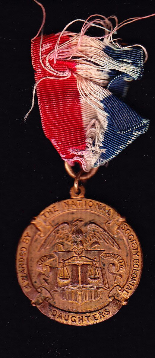 Foreign Medal - Awarded by the National Society Colonial Daughters to "William Howard Taft/Good citizenshipMedal/For/Excellence/In /Debate", brass, red, white and blue tattered ribbon.