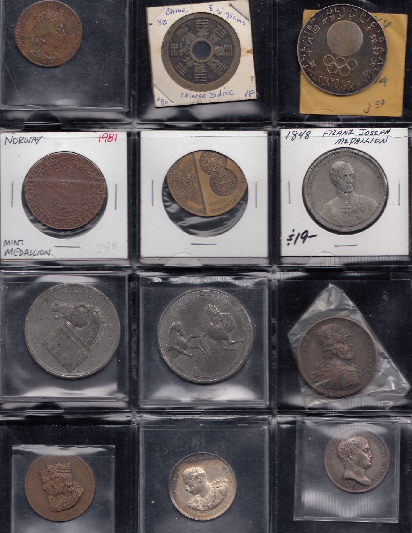 9 medals from Europe in base metals, some bronze; Napoleon silver specimen, Kaiser Wilhelm German specimen in silver; 1964 Tokyo Olympic silver medal; we recommend viewing. Lot of 12.