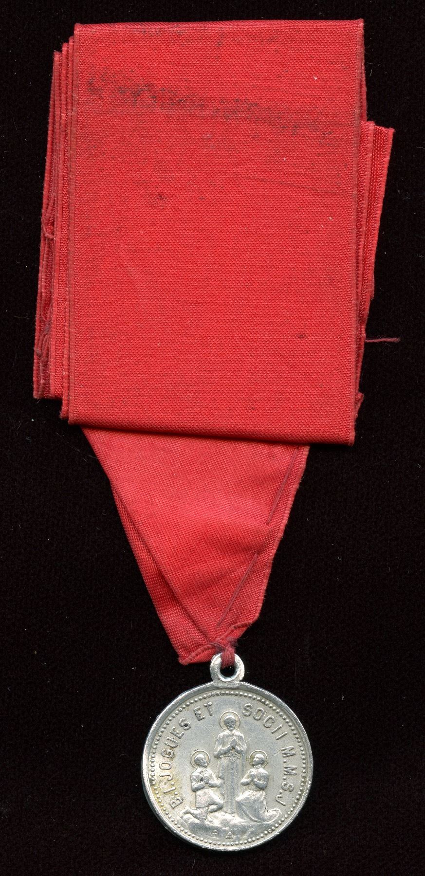 This listing is for an Antique Round Medal, made of a white metal, that has some light wear and patina. On one side, shows raised images of St. Brebeuf and other North American Jesuit Martyrs, with the words, "B. J. De Brebeuf Et Socii M.M.S.J." On the other side, raised images of St. Jogues and two other martyrs, and the words, "B. I. Jogues Et Socii M.M.S.J." Good antique condition with a bend and red ribbon.