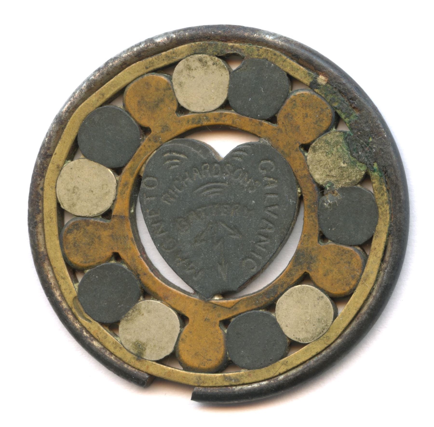 Richardson's Battery Quackery Cure All medal, circa 1880. It was work around the neck and thought to cure any disease known to man. Of course, it was strictly a quackery device but nevertheless still very interesting.