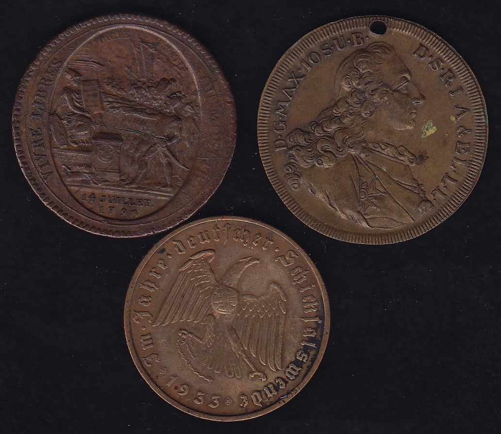 Foreign Medals. Includes: Bavaria, 1760, ruler Joseph on rev., bronze, top holed, EF; France, 1790, 5 sols, heavy scratches on rev., bronze, Germany; 1933, image of Hitler on obv., bronze. 3 Pcs.