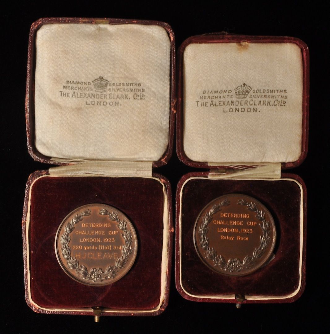 Foreign Medals - Deterding Challenge Cup, London, England, bronze, 220 yards, 1923, awarded to H.J. Cleave, in case of issue, UNC; Deterding Challenge Cup, London, England, Relay Race, 1923, bronze, in case of issue, UNC. 2 Pcs.