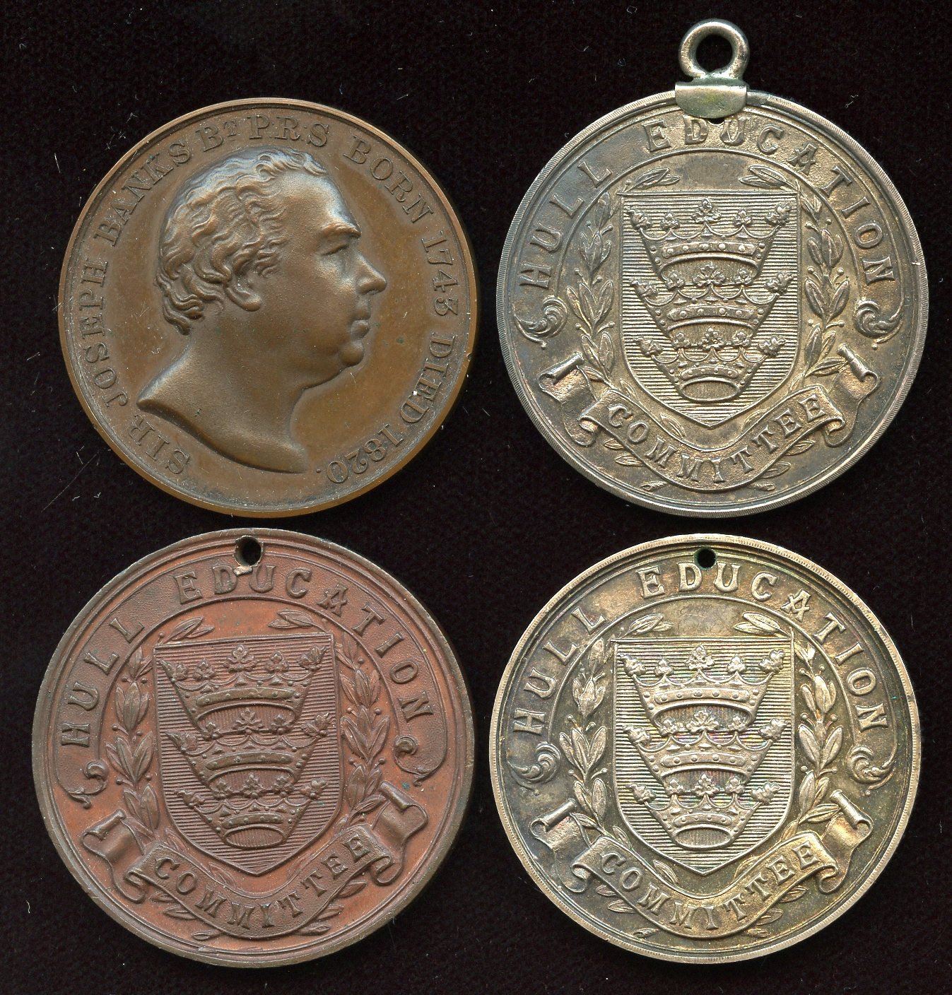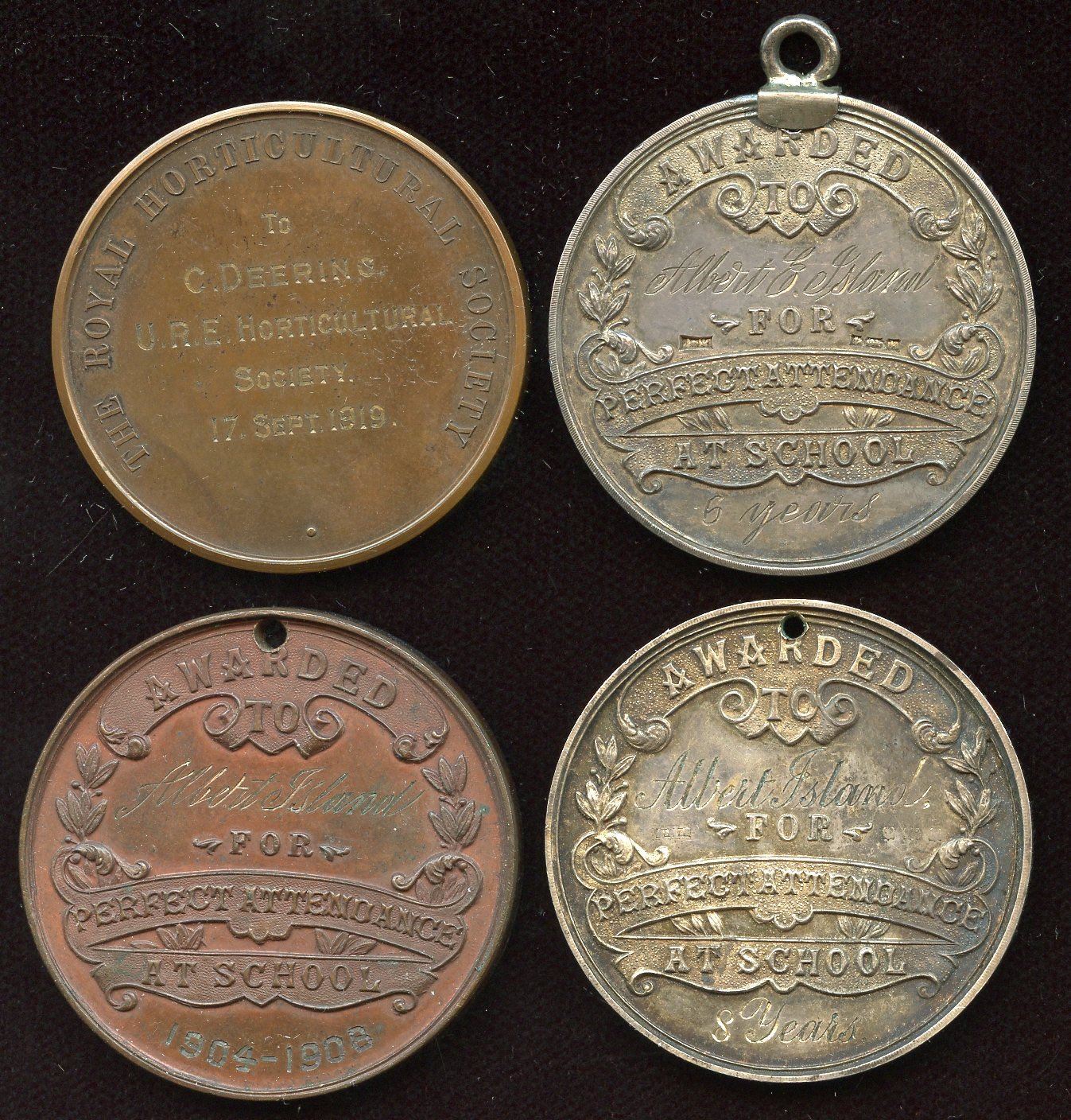 Sir Joseph Banks , Royal Horticultural Society, to " C. deering/ U.R.E. Horticultural/ Society/ 17 sept 1919" in case of issue; 3 medals of the Hull Education Committee, 2 silver, one copper all issued to Albert Island All of British origin. 4 Pcs.