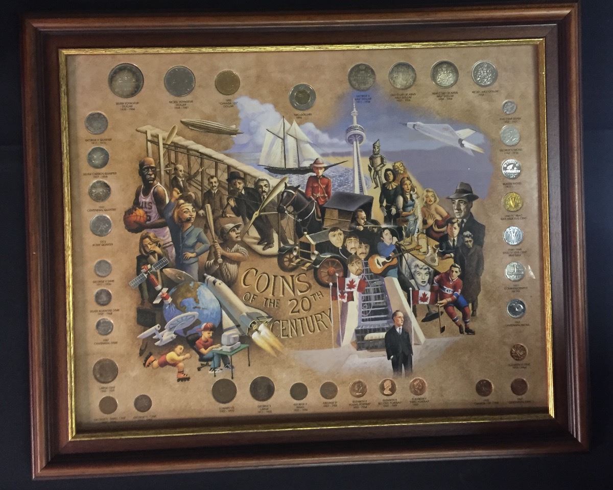 Framed Set of Canadian Coins of the 20th Century - Nice type collection includes 35 coins. Viewing is recommended, no return. Shipping cost will be $35+.