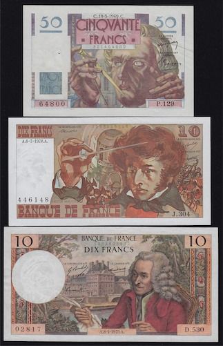 France - Nine different notes, 1939 to 1993, P-83, 94, 127b, 128a, 147c, 151a, 154g, and 156e. Catalogue value over $450. All original EF or better. 9 Pcs.