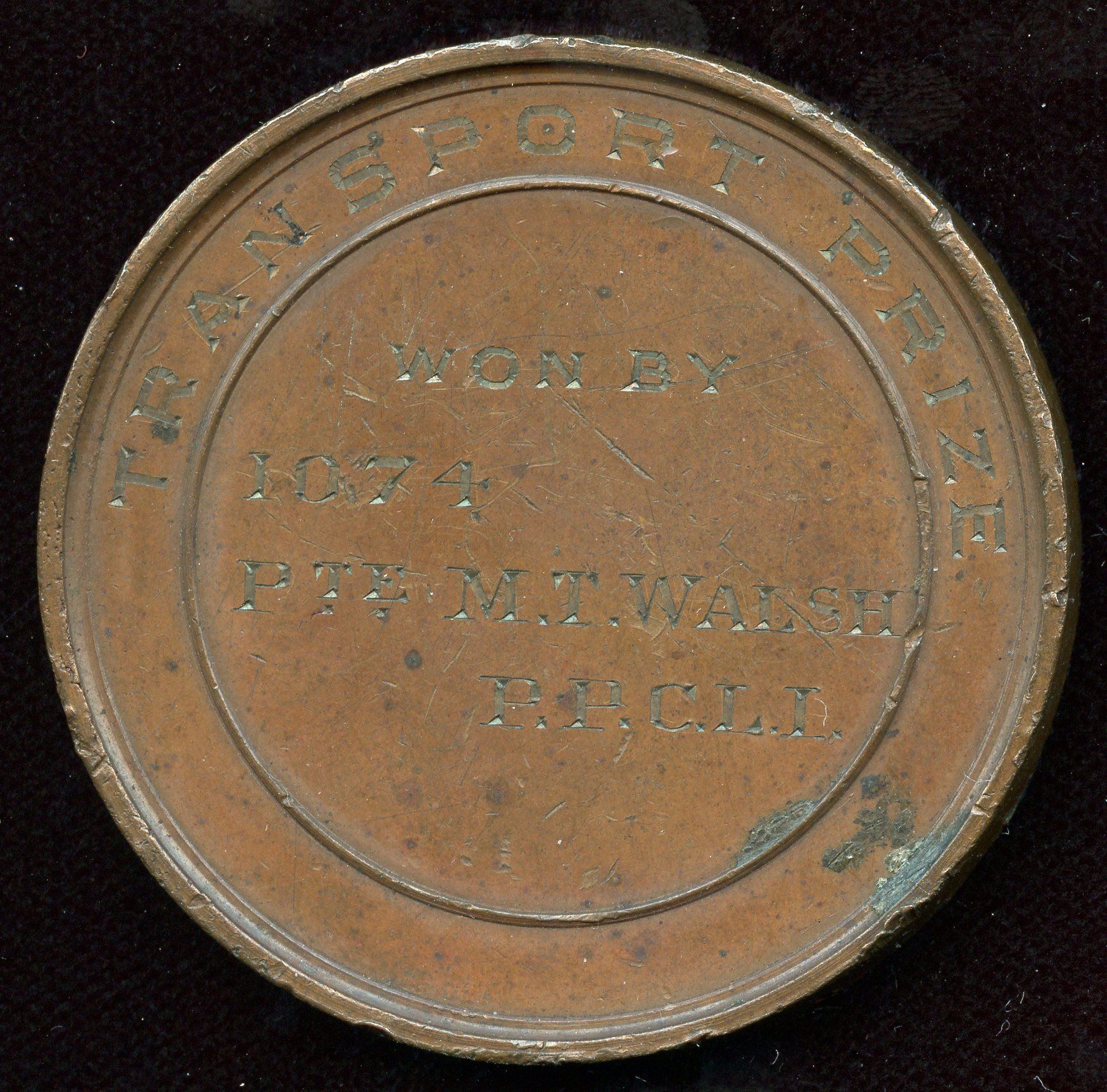 Obv " First/ Army/ Horse Show/ France/ 25 June 1917", Rev "Transport Prize. Won By/ 1074/ Pte M.T. Walsh/ P.P.C.L.I.", bronze, 52mm, EF, medal used to encourage care of horses, etc.