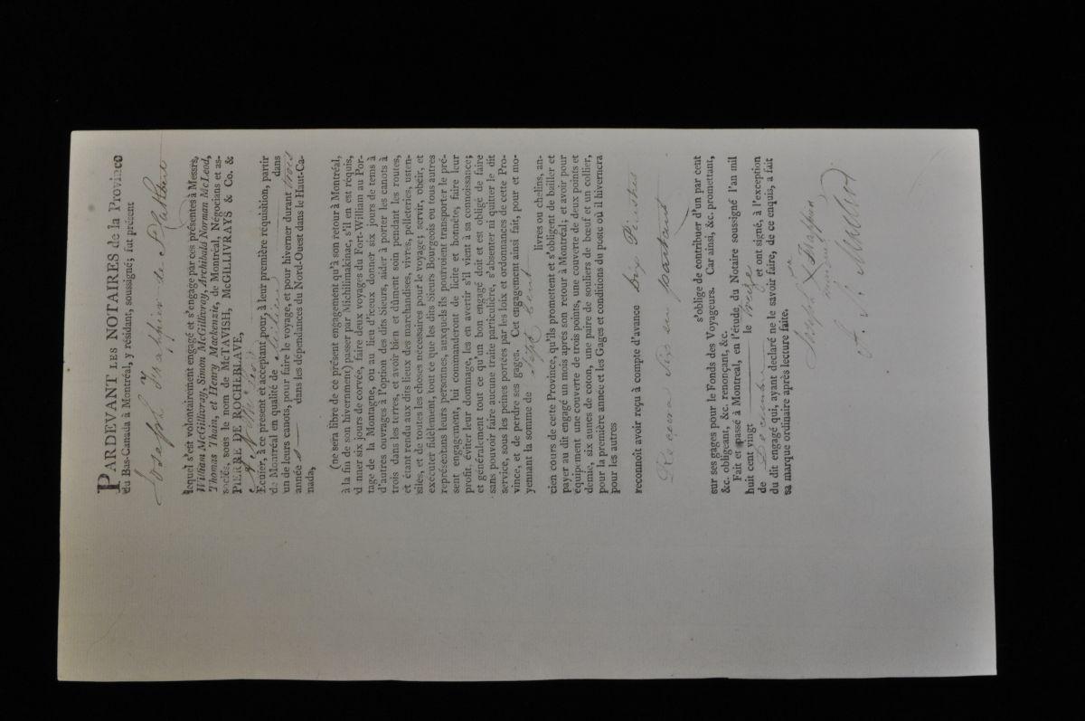 A great fur trade document from Montreal in 1823. It is a contract between the North West Fur Trading Company and Joseph Frappier of St. Hubert to paddle a 'frator" canoe to Fort William. A.N. M'Leod represented the company. Frappier signed with a "X" because he was illiterate. M'Leod was a principal in the North West Company and had been a fur trader since 1792.Mint condition.*