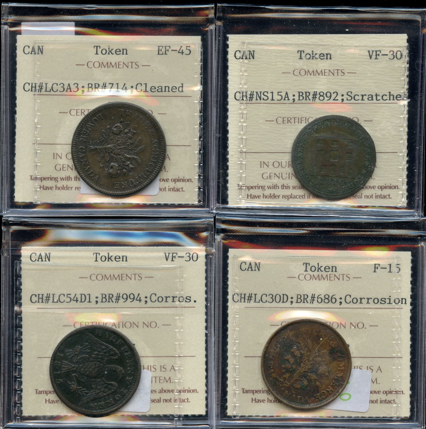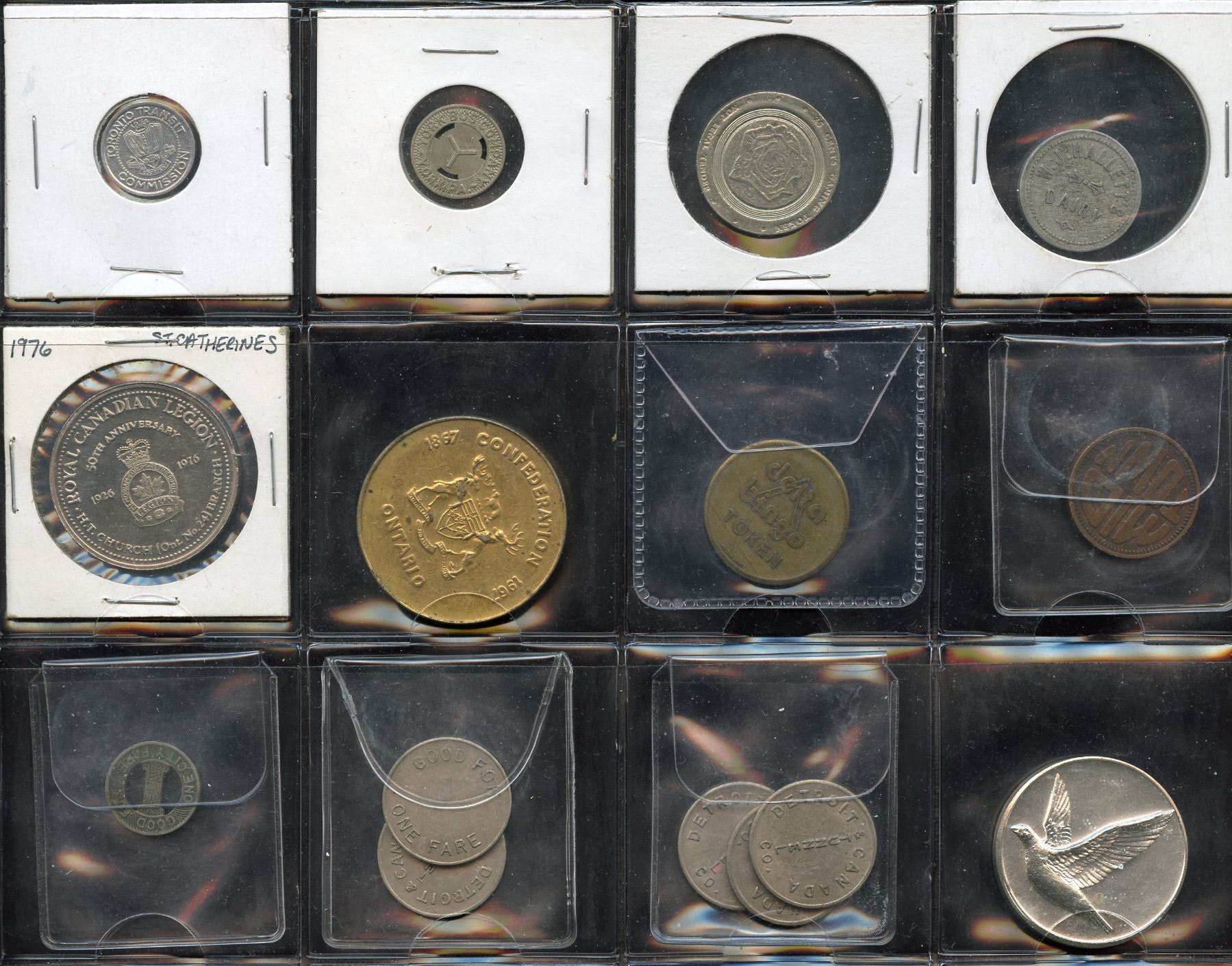 Let the fun begin...4 ICCS Graded tokens. Canadian Countermark Lot of 5. 18 misc. tokens all identified. Few transportation tokens, etc...Dig in!