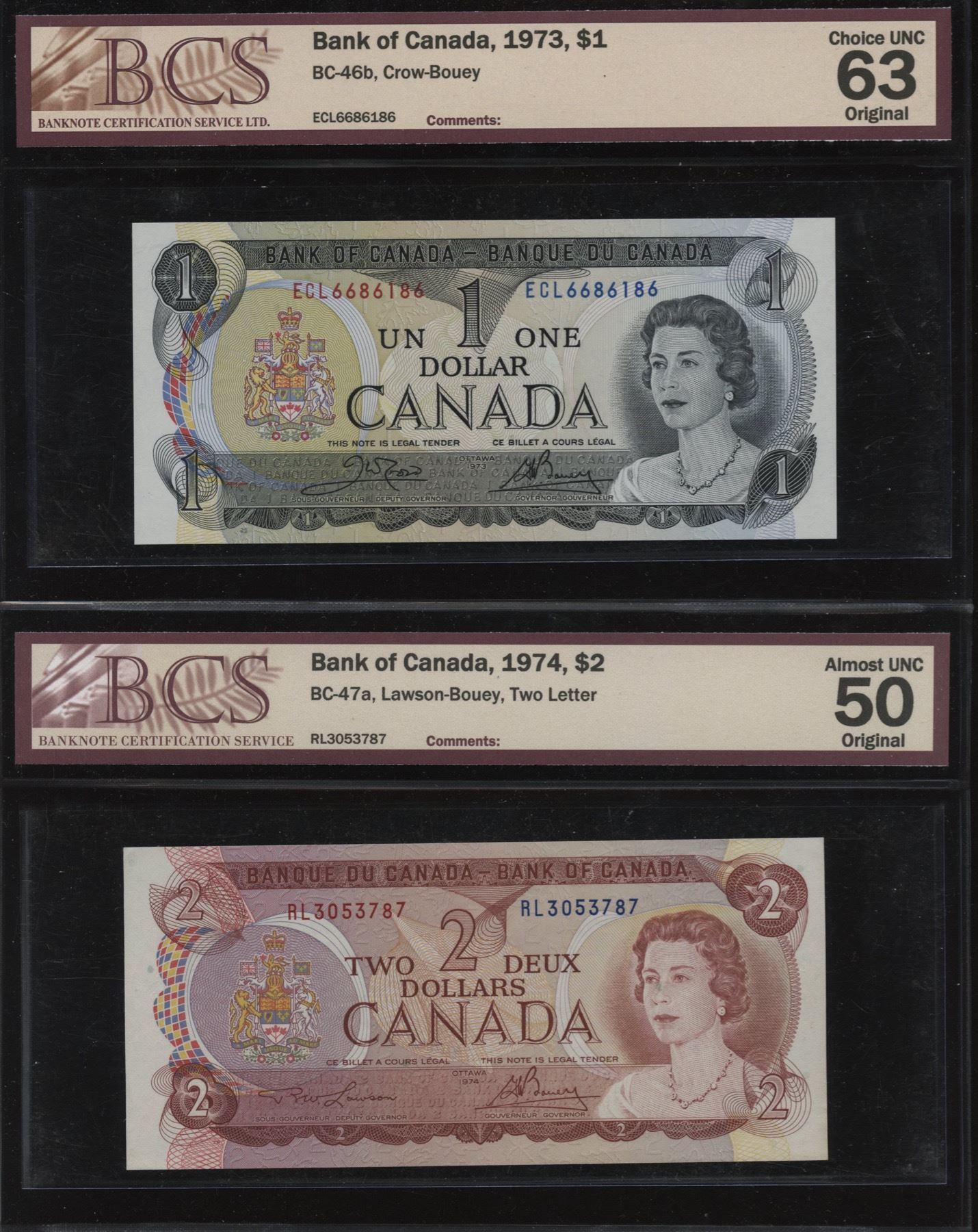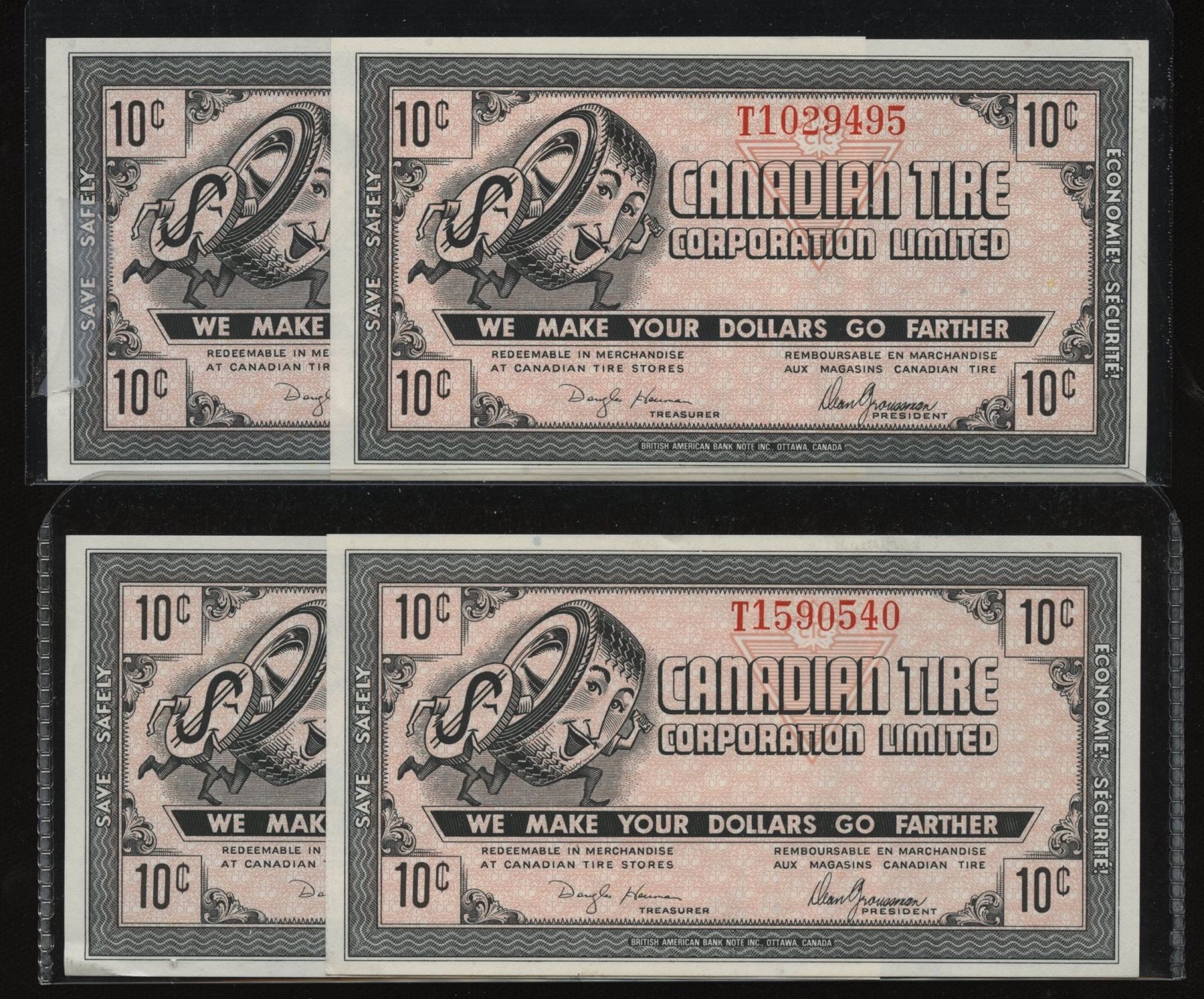 Includes: 4 Unc. Canadian Tire Ten cent notes, couple BCS Graded banknotes, and a nice collection of USA elongated pennies and dimes. Cool group!
