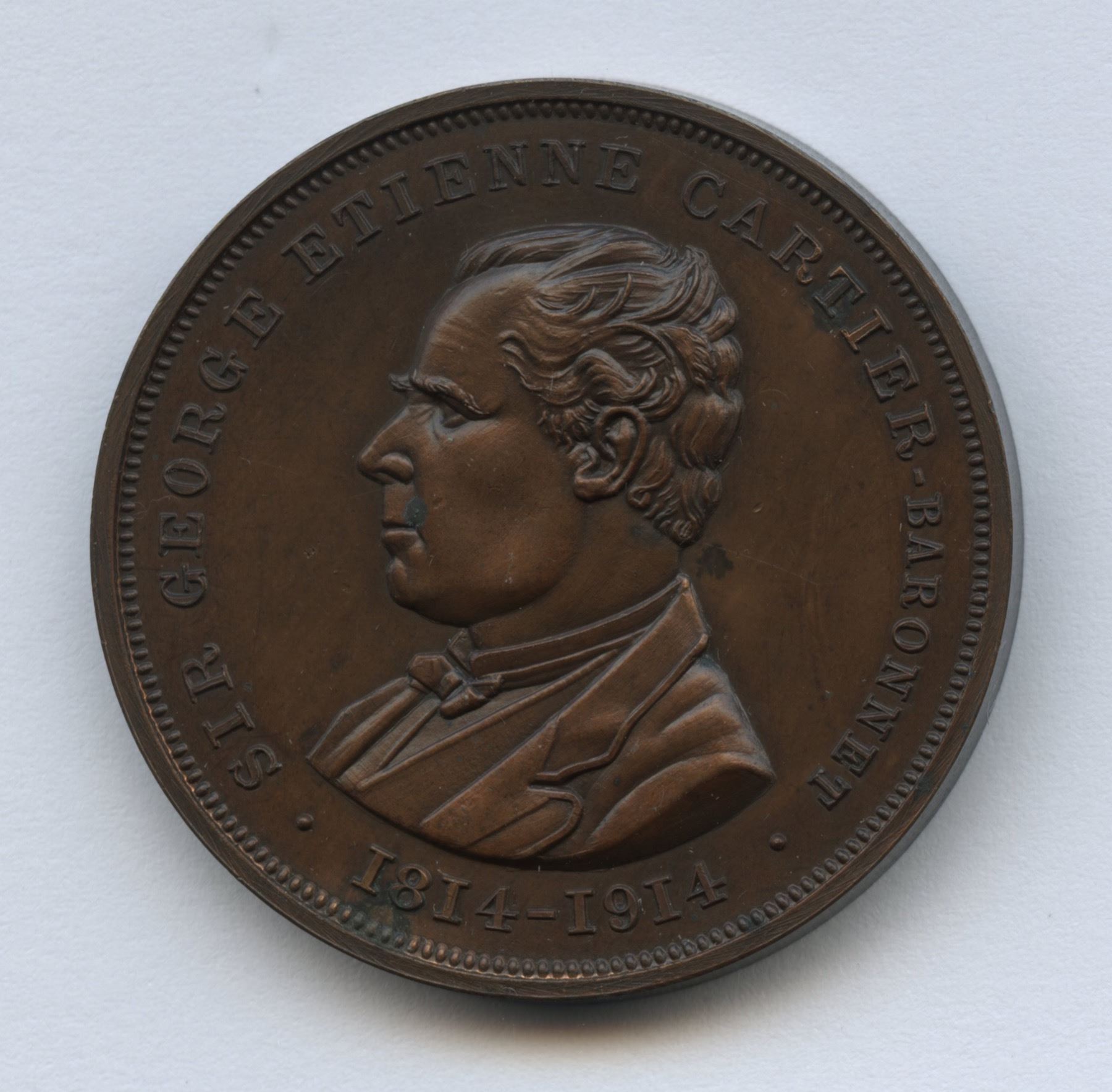 Copper, issued when a monument was unveiled in 1914 in Quebec. A gold medal was presented to King George V, large medals to statesmen and rulers and smaller versions to the general public. This specimen is 35 mm and AU/Unc. Cartier was a Father of Confederation and French Canadian statesman.