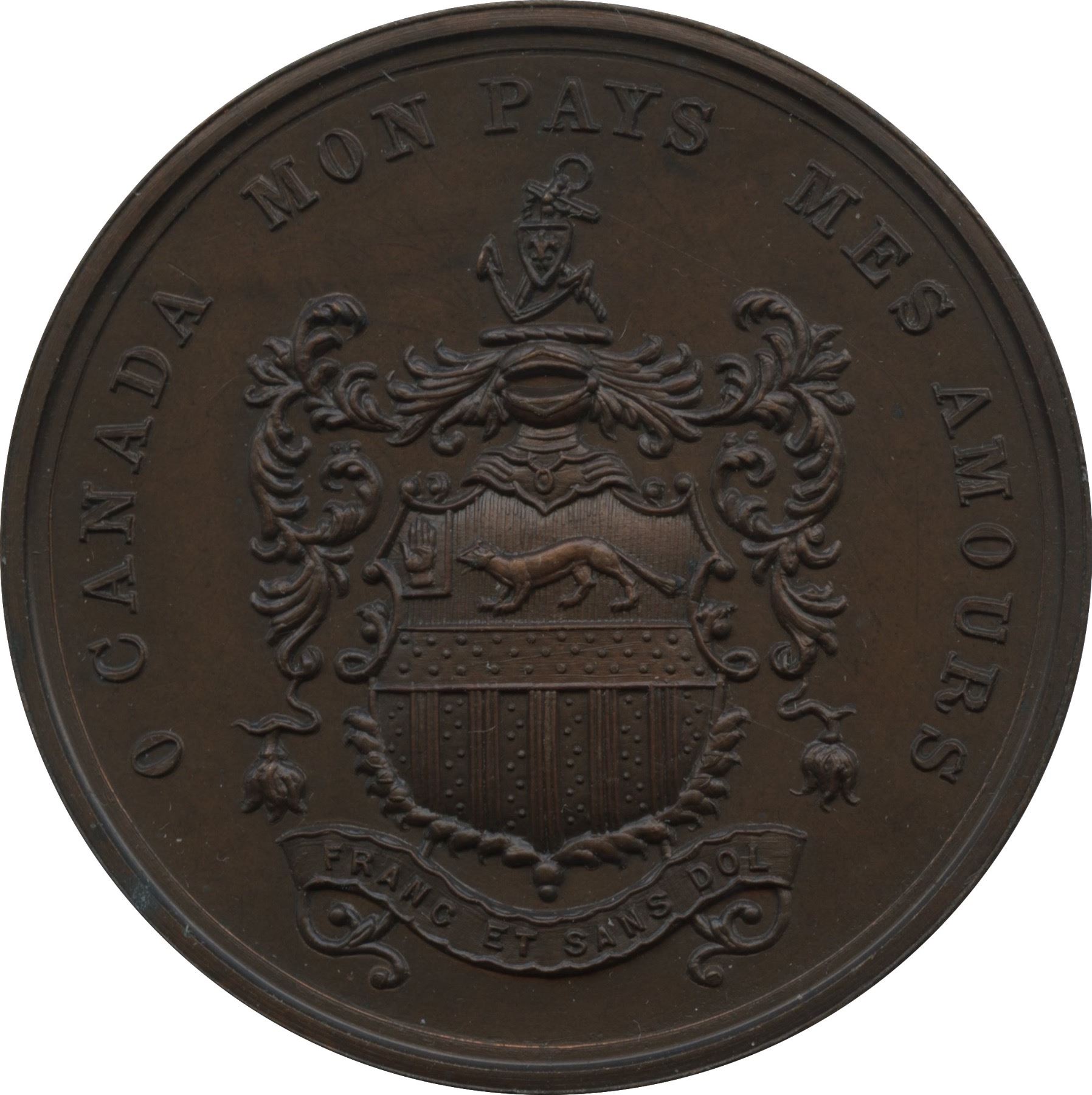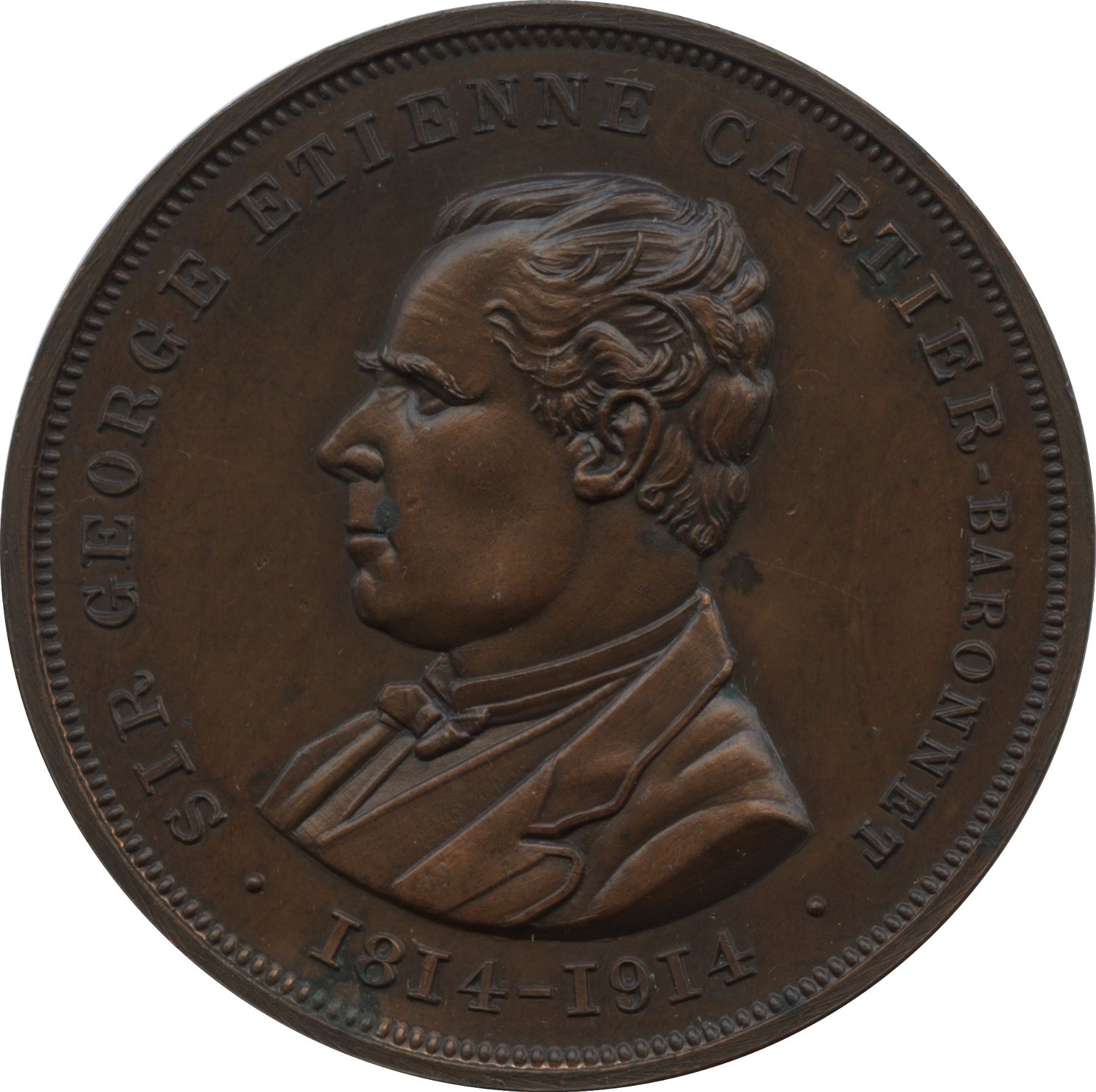 Copper, issued when a monument was unveiled in 1914 in Quebec. A gold medal was presented to King George V, large medals to statesmen and rulers and smaller versions to the general public. This specimen is 35 mm, 23.2g, and AU/Unc. Cartier was a Father of Confederation and French Canadian statesman.