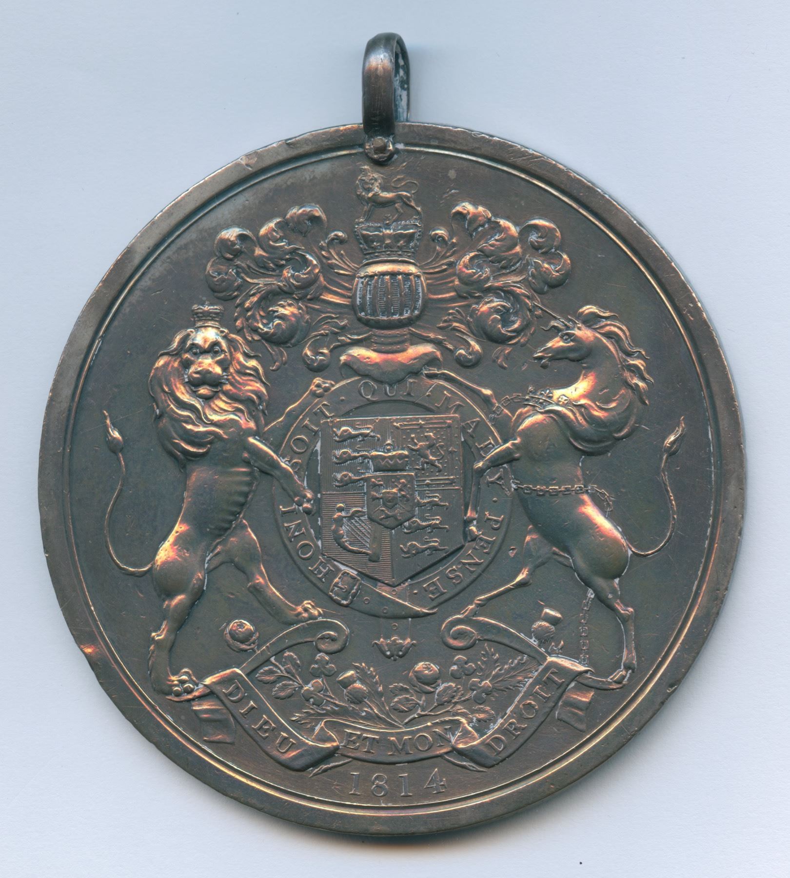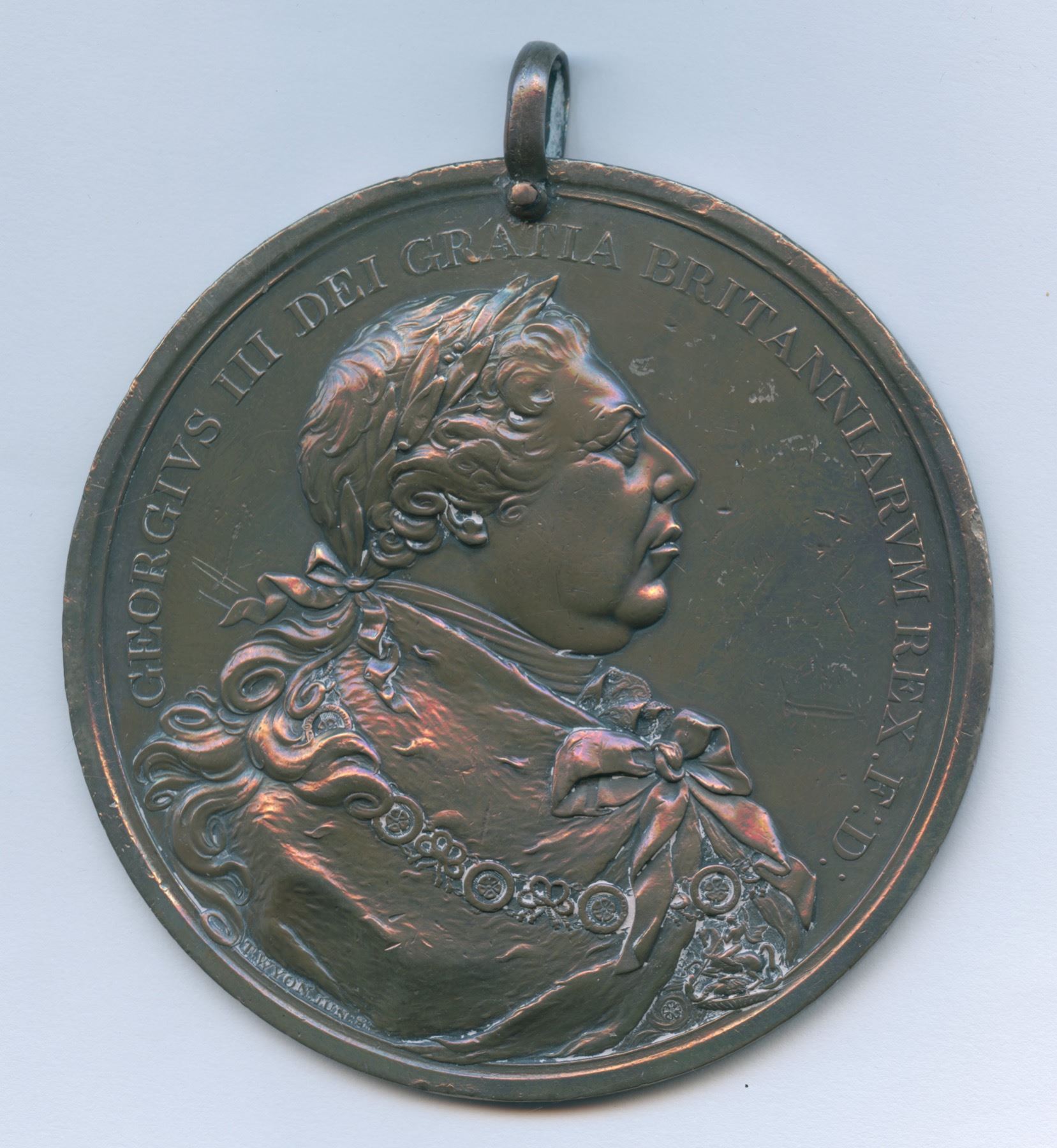 Medals from this issue were distributed to North American Indian Chief's from 1776 until 1814. They were very much 'war' medals rather than commemorative medals and they attracted influential Indians throughout what is now Canada and the United States of America to the British cause and were worn with great pride by the recipients and their descendants. The British Government tried to prevent seizures of tribal land by settlers for personal gain and enlisted indigenous tribes (about 13,000 men, mostly Shawnee, Iroquois, Cherokee, Creek and Seminoles) as Allies to fight the Thirteen Rebel Colonies in 1776-83, the United States in 1812-14 and to defend Canada. Both the Indian and métis (mixed blood) communities overwhelming sided with the British during the American Revolution. They were badly needed for military manpower. Very early in the revolution, the Americans posed a direct threat to Canada, and the famous Charles de Langlade (who was half Ottawa) led Indians from Wisconsin and Michigan in two campaigns against the Americans in 1776 and 1777. Louisiana was still a Spanish possession in the late 18th century, and both the Spanish and the rebel colonies were fighting the British by 1778. The Indians of northern Wisconsin, and upper Michigan joined the British in an attack against St. Louis in 1780. The attack failed, and some Indians who took part in it were attacked by Indians under Siggenauk as they retreated through Illinois. The 1783 peace treaty between the United States and Britain transferred the entire trans-Appalachian West, including Wisconsin, to the United States. The United States did not occupy any part of the upper Midwest until almost fifteen years after the American Revolution. The British refused to give up posts at places such as Mackinac Island and Detroit until the United States agreed to certain stipulations of the 1783 treaty. Moreover, the United States focused most of its energy on defeating the powerful Indian confederacy in Ohio between 1790 and 1794. The United States defeated the Ohio Indians in 1794 and forced them to sign a treaty that gave away much of their land. That same year, the United States and Great Britain signed Jay's Treaty, which settled outstanding differences between the two countries. The British abandoned their posts in the Midwest, and the United States took over the British Fort Mackinac in 1796 and established forts at Chicago (Fort Dearborn, 1803), and Des Moines (Fort Madison, 1808). These small forts were inadequate for controlling a large geographical area with a population opposed to their presence. Midwest tribes and resident fur traders remained solidly pro-British during the 1790s and early 1800s. First, British companies such as the North West Company controlled the regional fur trade. Second, wars against the Ohio Indians in the 1790s revealed to all Midwestern Indian tribes that the United States wanted to acquire their lands. Even Indians such as Siggenauk - who once supported the Americans - switched sides. In 1805 an Ohio Indian named Tenskwatawa, or the Shawnee Prophet, began to preach Indian resistance to American encroachment. He gained many adherents throughout the Midwest and Wisconsin, and Ojibwe from as far away as Lake Superior flocked to his village in Ohio and later in Indiana to hear his message. The Ho-chunk were particularly receptive to his message. The Shawnee Prophet's brother, Tecumseh, took an active role in forming a military confederacy of several Midwestern and Southeastern tribes to resist American expansion. During the War of 1812 the British in Canada and Indians under Tecumseh's leadership became allies against the United States. When the War of 1812 began, the weakness of America's hold over the Midwest was apparent. A combined Indian and British military force left their fort on St. Joseph's Island and conquered the American fort at Mackinac Island without firing a shot. Meanwhile, the Potawatomi slaughtered the entire American garrison at Chicago. British fur trader Robert Dickson organized Wisconsin Indians to fight the United States. The Menominee, Ho-chunk, Ojibwa, Ottawa, Santee Dakota, Sauk, and Fox all fought on the side of the British during the war and fended off American attempts to regain control of the region. In 1814, the United States established a small post at Prairie du Chien called Fort Shelby, but the Indians and British militia quickly conquered it, renamed it Fort McKay, and defeated two American relief expeditions sent up the Mississippi River from St. Louis to retake it. That same year, Indians from Wisconsin and Michigan repelled an American military force that attempted to retake Mackinac Island. The United States found the area of Wisconsin and northern Michigan virtually unassailable, and throughout the War of 1812, it remained firmly in the hands of the British and their Indian allies.