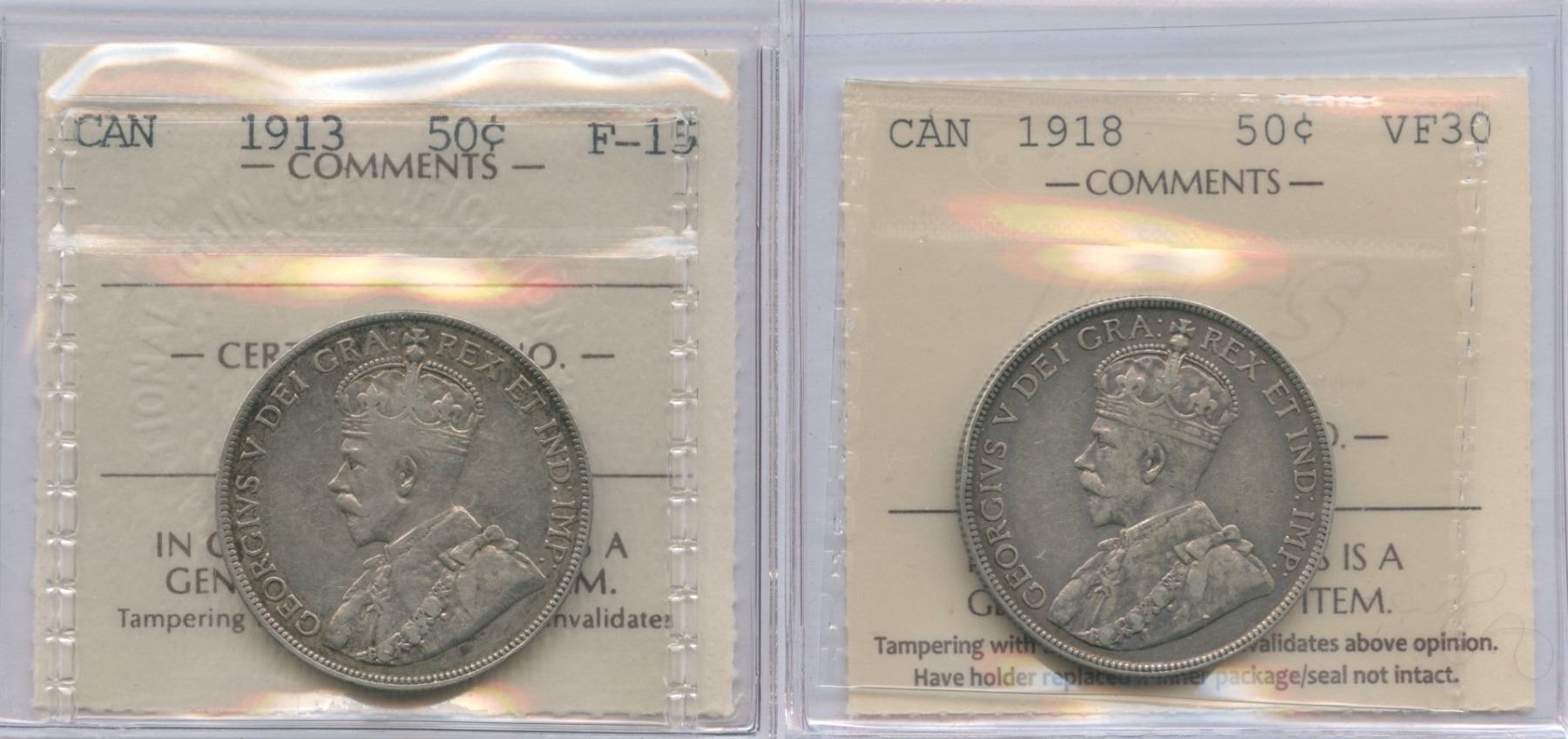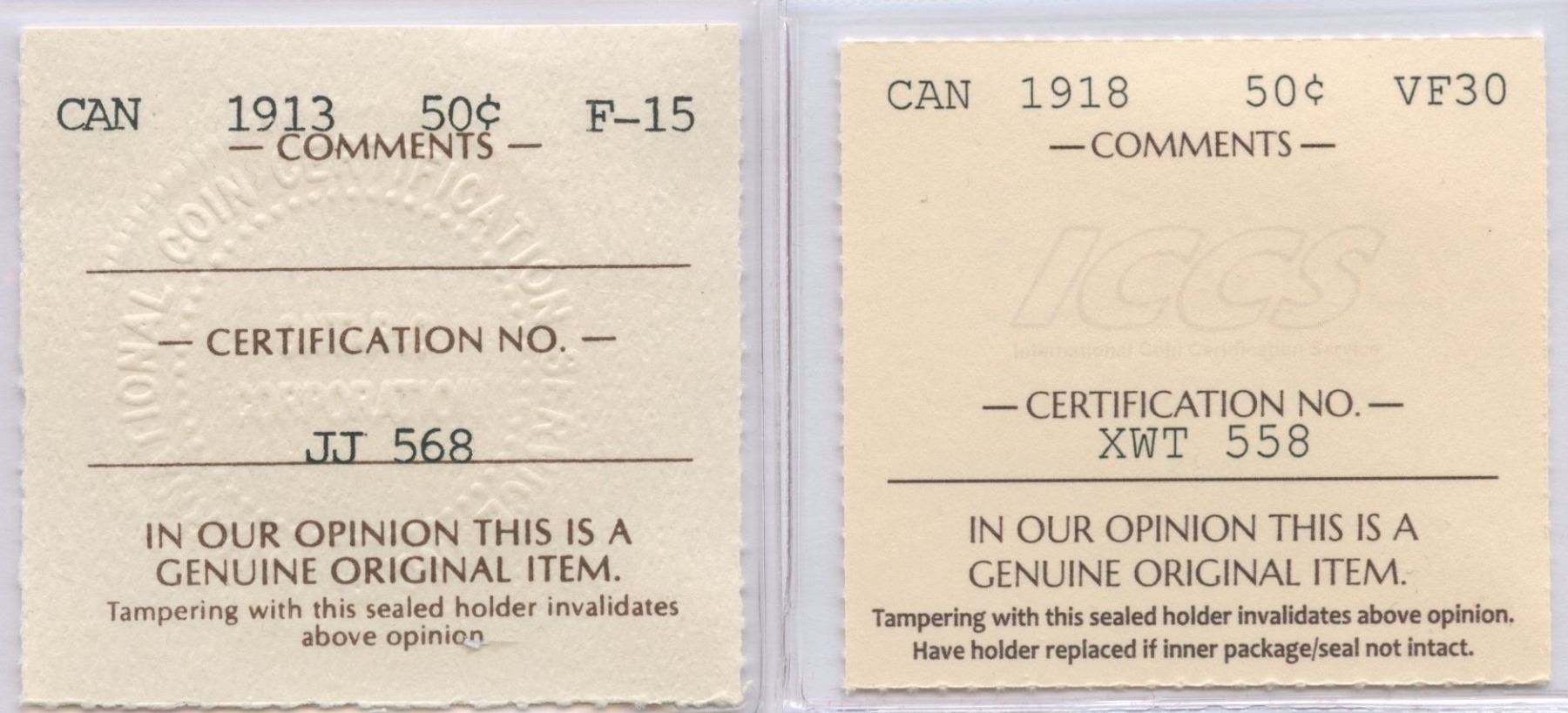 1913 ICCS F-15; Older embossed 2-letter certificate. || 1918 ICCS VF30. 2 Pcs.