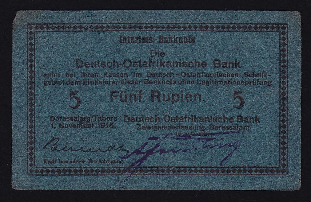German East Africa - 5 Rupien 1915 Letter "E", P-35, corner tip off otherwise EF. Scarce.