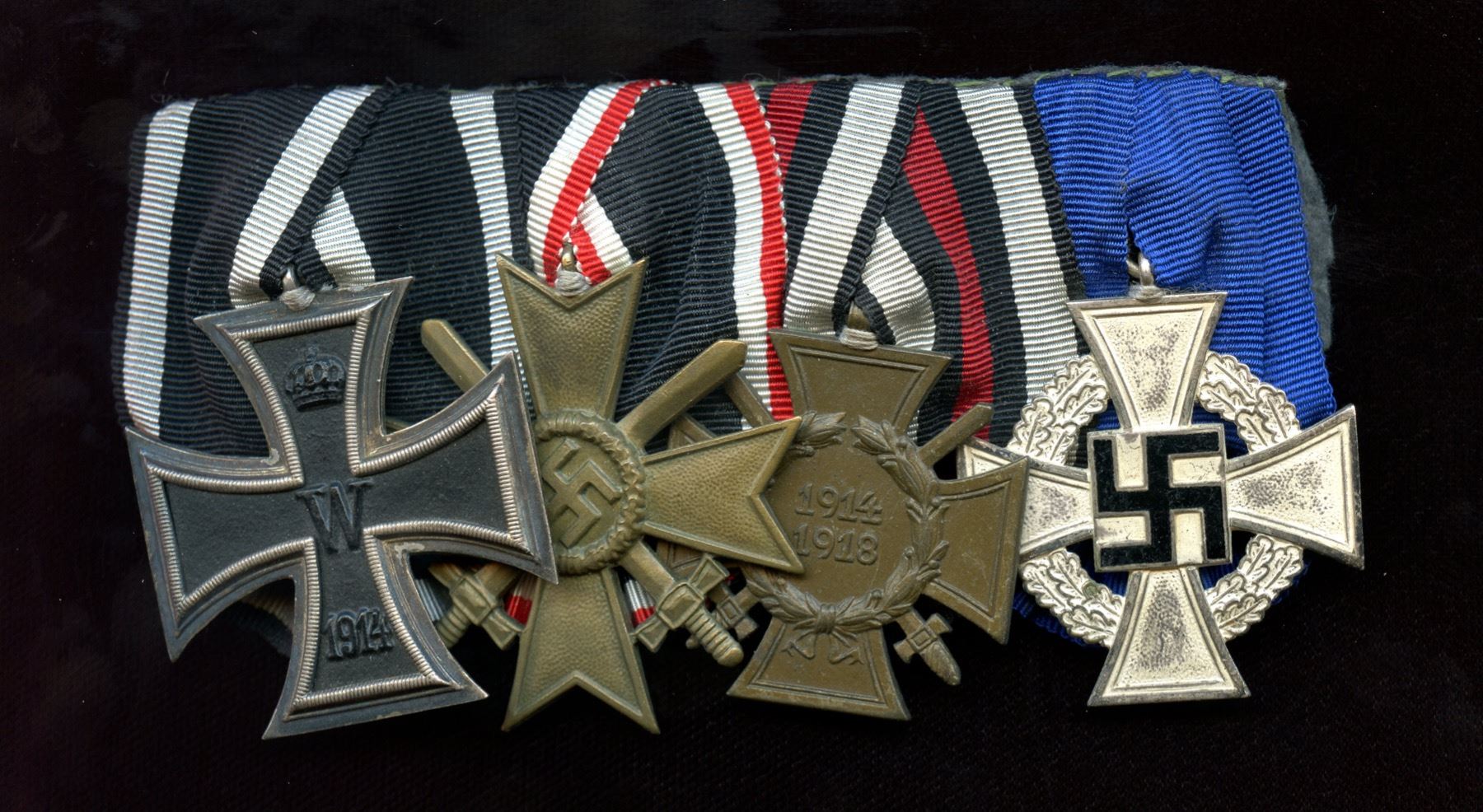 Second class iron cross WW1, WW2 War merit cross with swords, Hindenburg cross, faithful service declaration (second class). 4 Pcs.