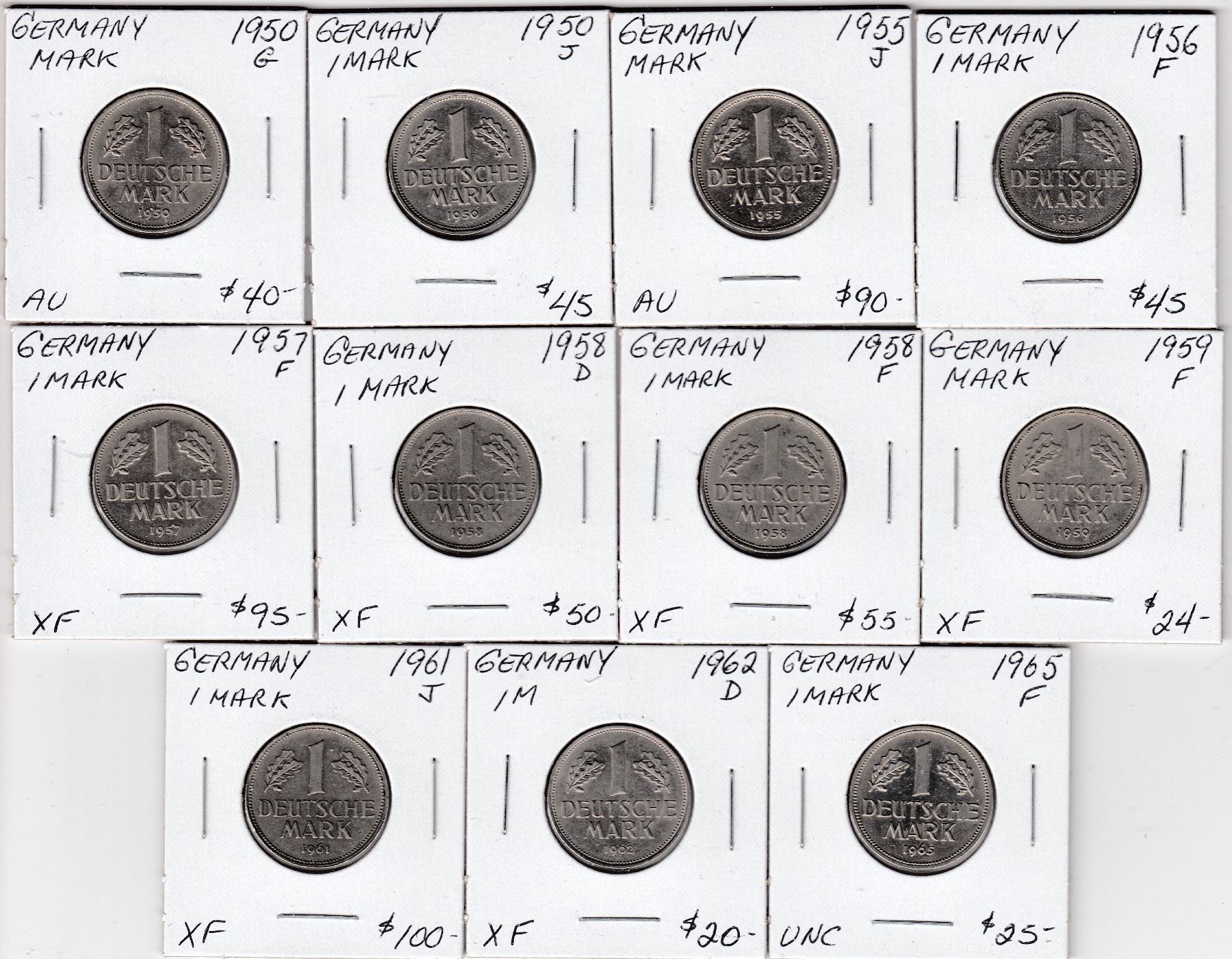 1 Mark: 1950G; 1950J, 1955J, 1956F, 1957F, 1958D, 1958F, 1959F, 1961J, 1962D, 1965F. 11 Pcs.