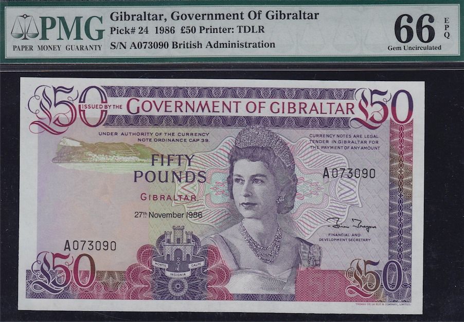 Gibraltar, Government of Gibraltar 50 Pounds. P-24, 1986 50 Pounds, PMG 66 Gem Uncirculated EPQ.
