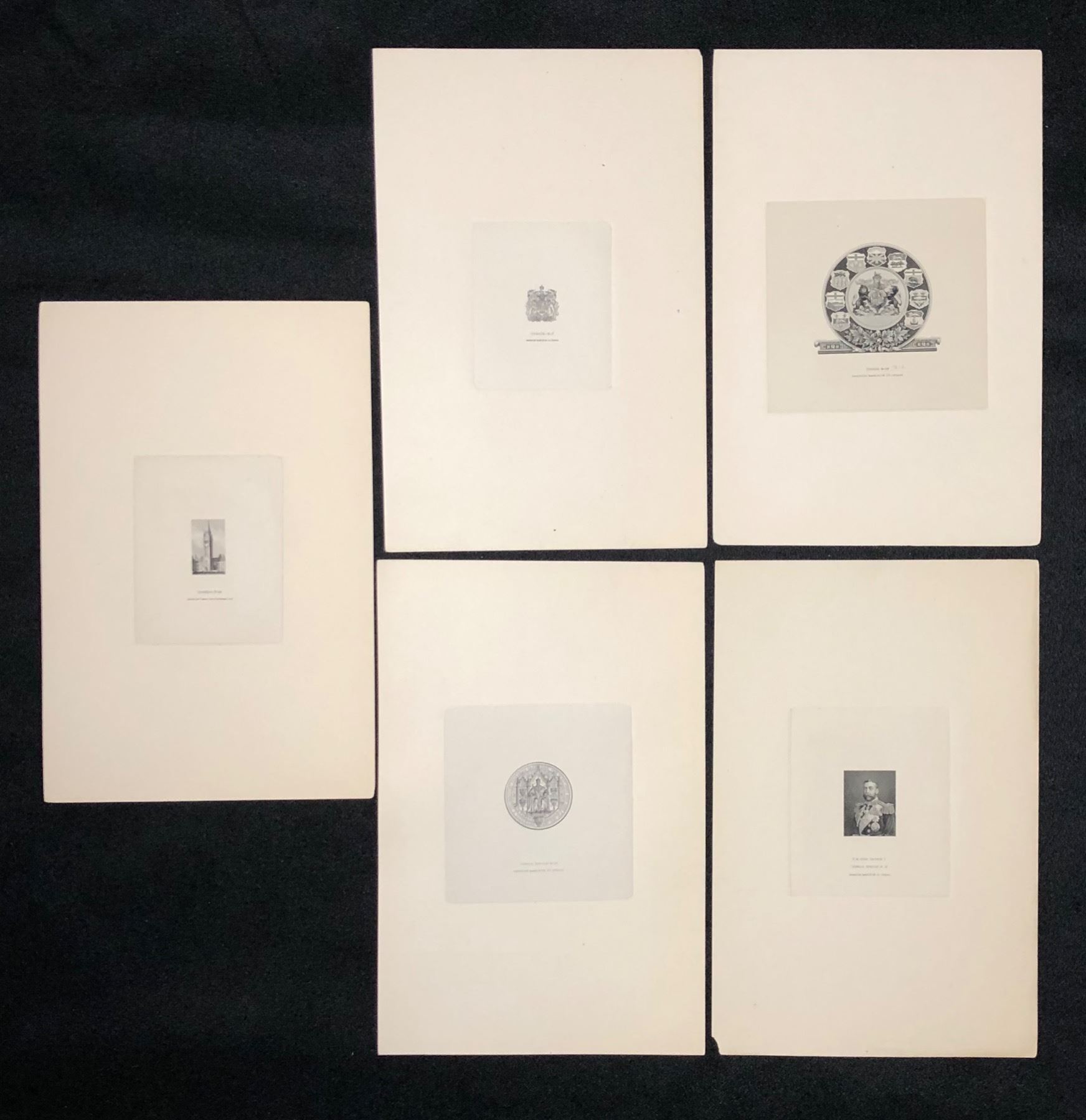 Government Die Proof Vignettes on full card: B-12 (altered in pencil to B-13), Provincial crests, somewhat similar to back of 1914 $2 but probably created for use on bonds; Canada B-15, Great Seal (King Edward VII); Canada B-17, Coat of Arms; A-19, King George V; B-24, Peace Tower. All printed by ABN but the last, which is by CBN. Five items, most in excellent condition but a couple with a minor bent or missing corner.