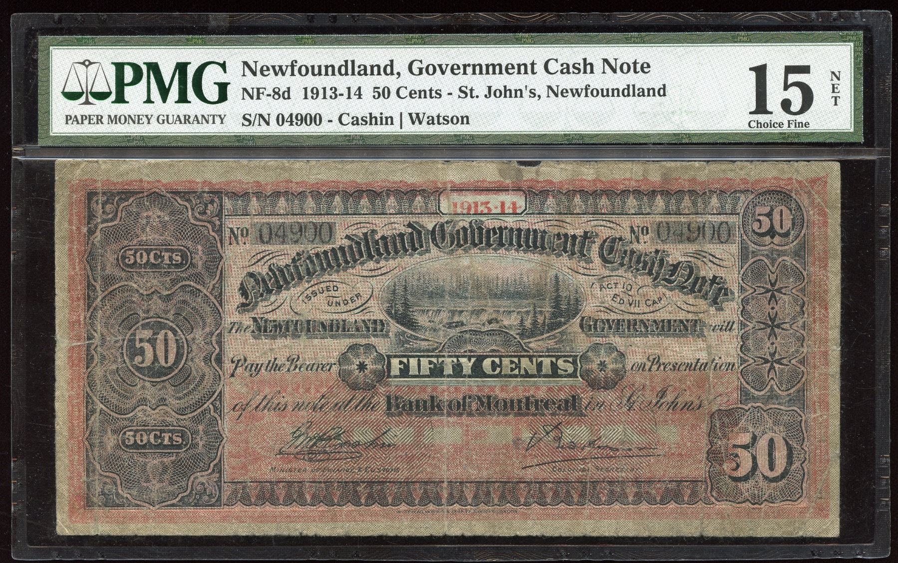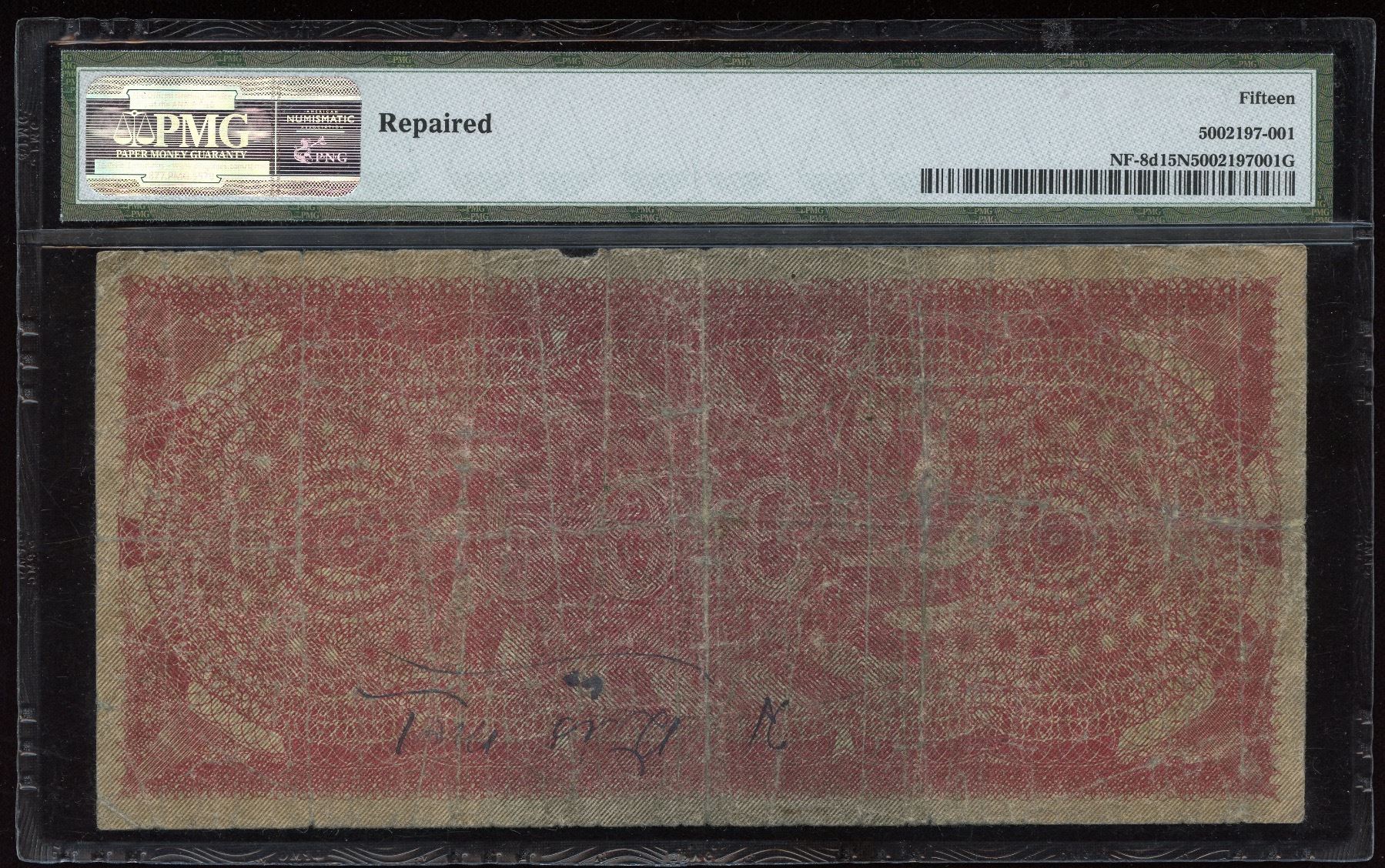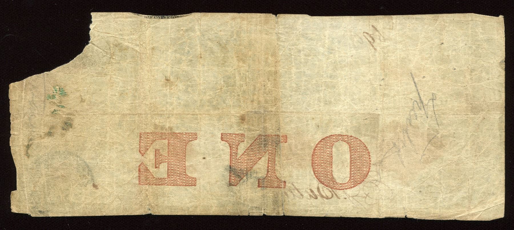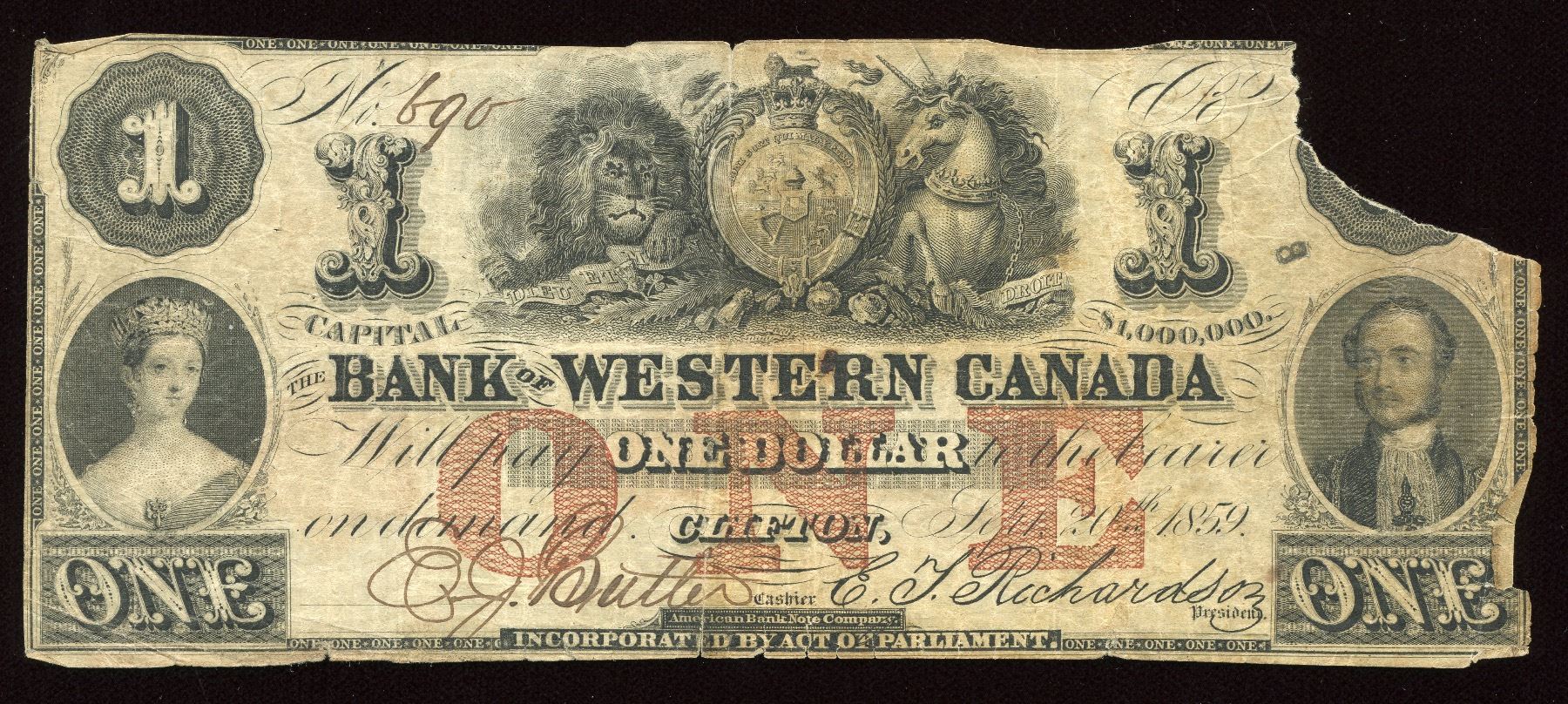 NF-8d. PMG Choice F-15, repaired, writing on back. S/N: 04900; $1 1859 The Bank of Western Canada, Fine with top right corner missing. 2 Pcs.