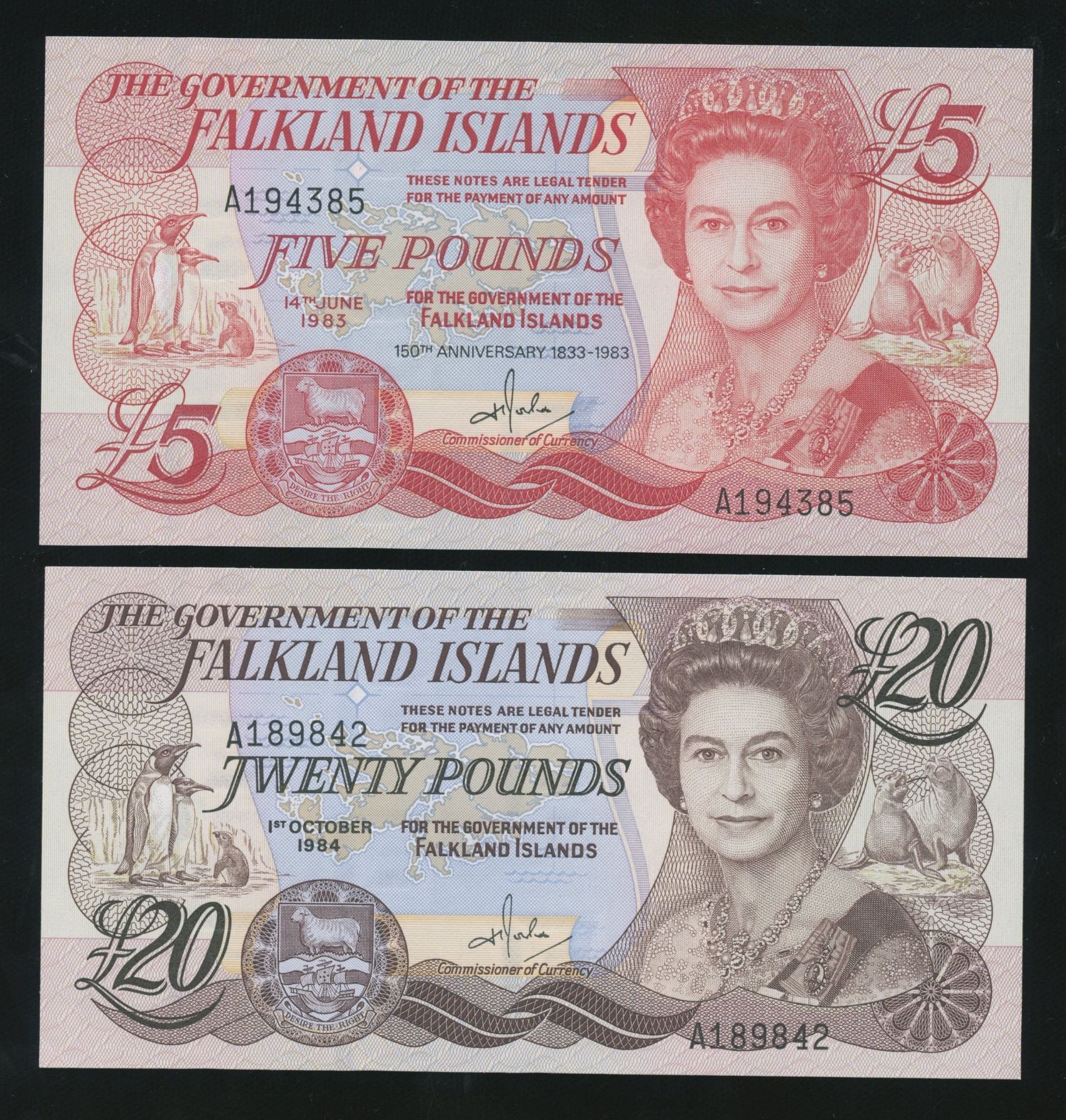1983 Five Pounds. P-12a. 1984 Twenty Pounds. P-15a. Both Unc's. 2 Pcs.