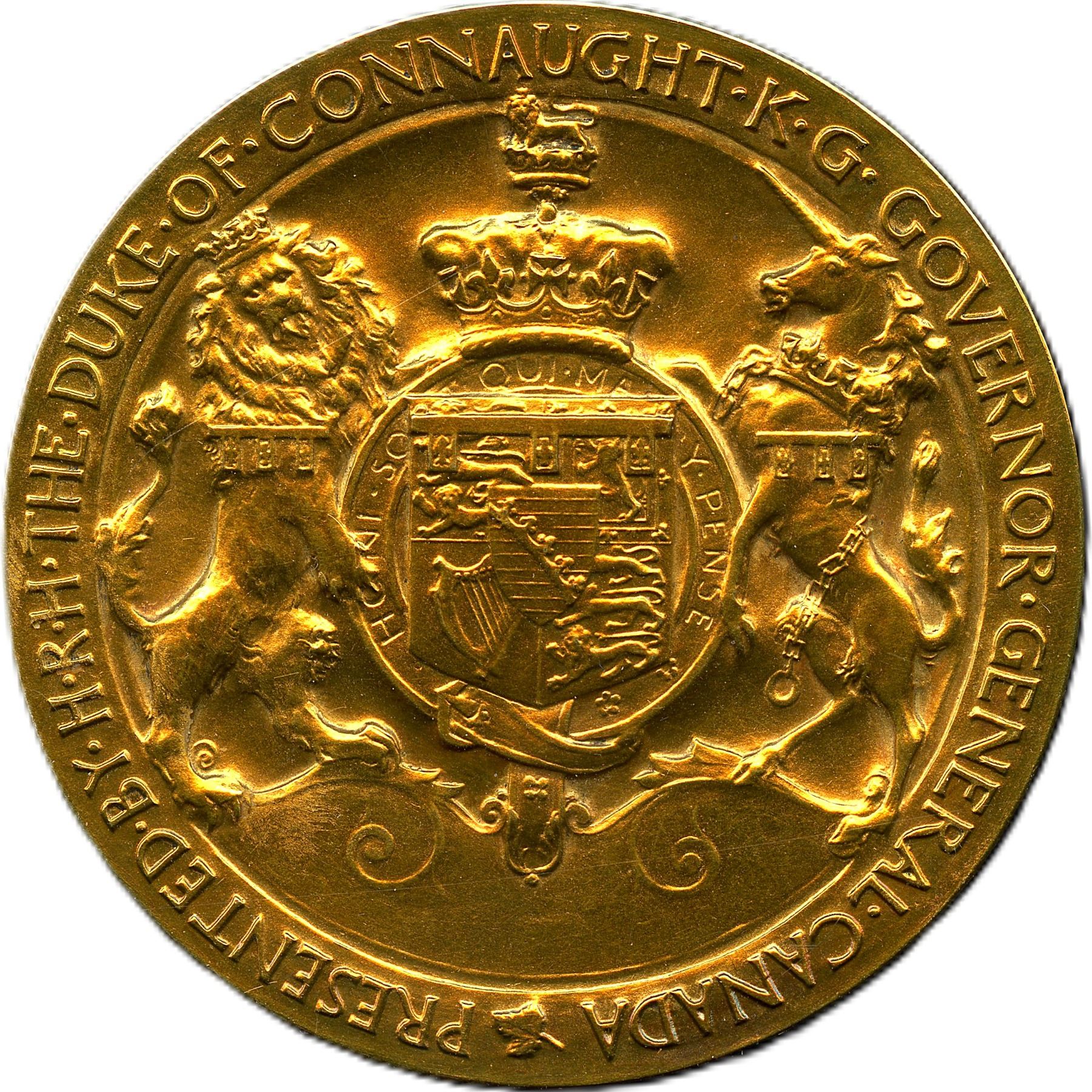 CL 110. According to Freeman Clowery, only 30 of these medals were issued in gold. 52.3mm, 103.6g of 18k. This is a gem, with DALHOUSIE UNIV. 1913. WALTER. M. BILLMAN HIGH HONOURSIN CLASSICS. In original case. From the Geoffrey Bell Collection.