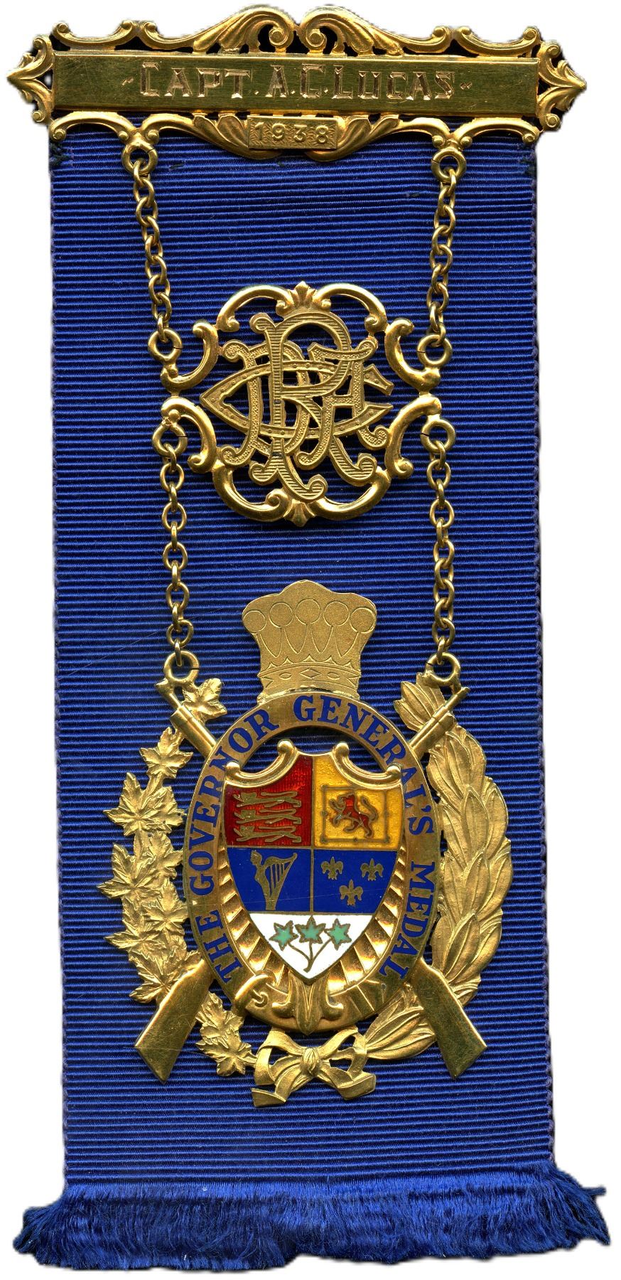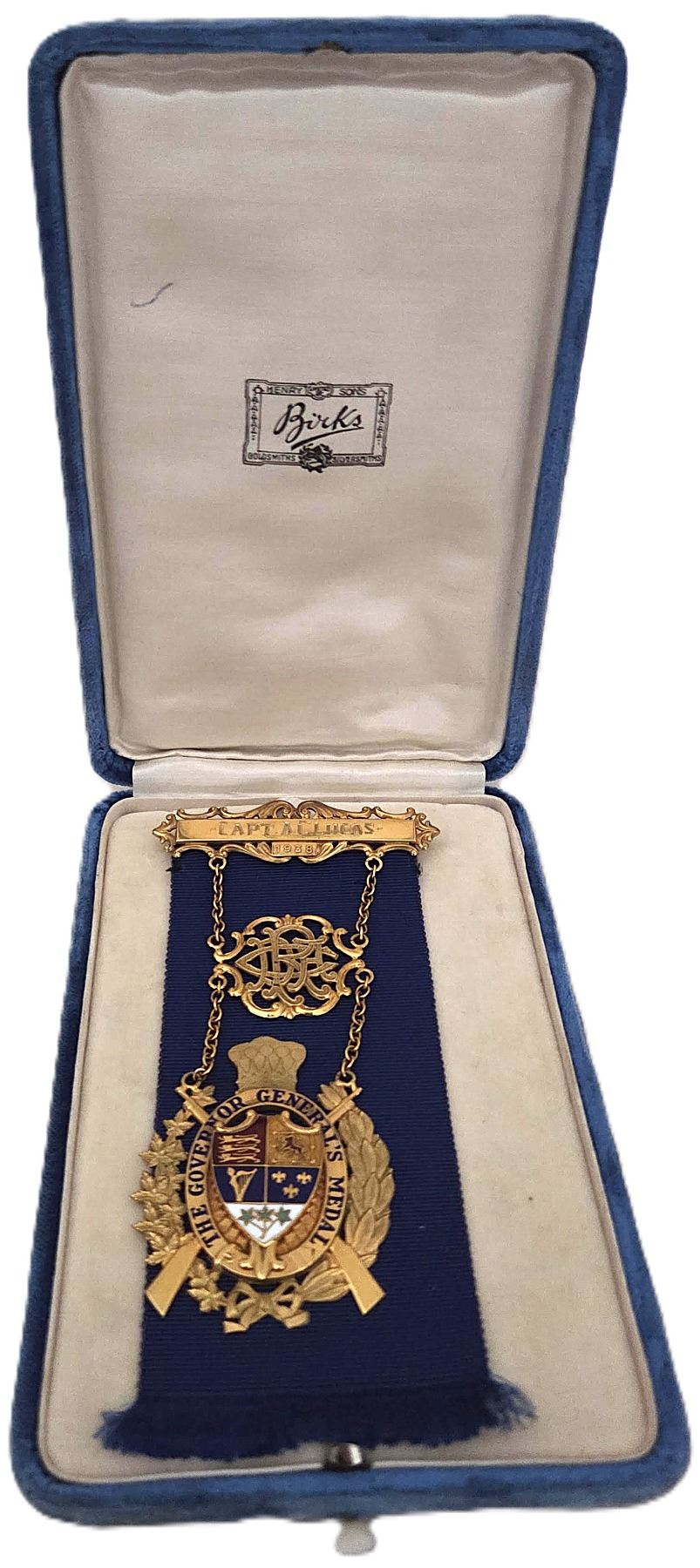 Awarded to Capt. A. Lucas, produced by Birks in original case, 10k, approx 37g. From the Geoffrey Bell Collection.
