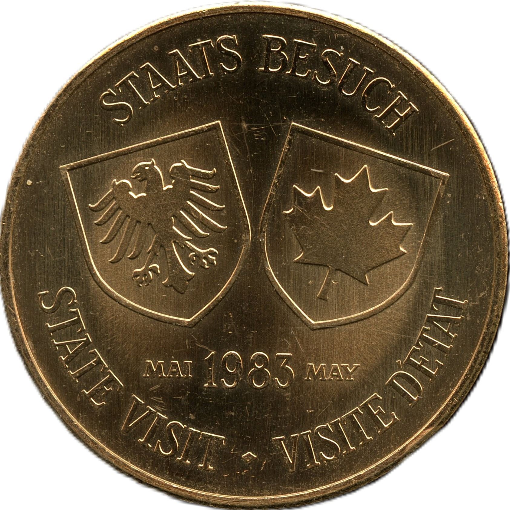 CL 123 SV-2, UNC, 33.1g, 35.8mm. State Visit 1983 to Besuch Staats, gilt bronze. Only 40 were issued. From the Geoffrey Bell Collection.