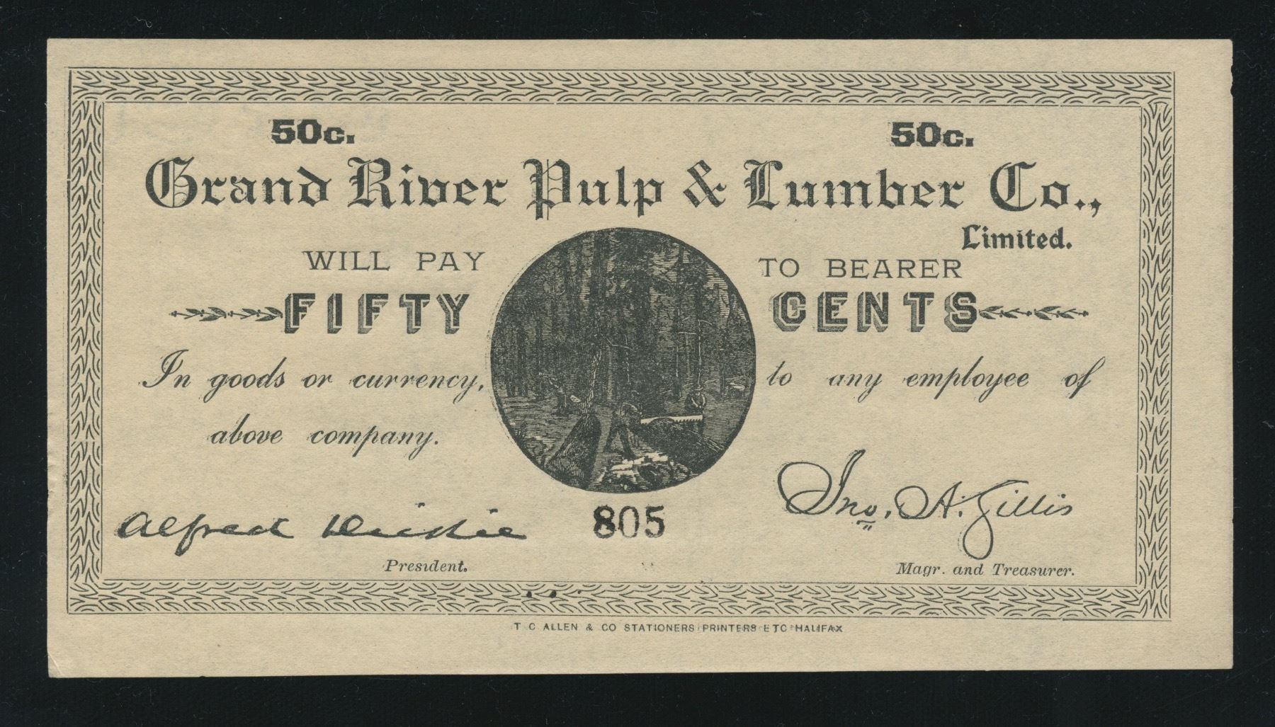Undated circa 1900. The fourth of five pieces of uniface fractional scrip from this rare Newfoundland issuer. Printed by T.C. Allen & Co. of Halifax with each denomination having its own color and sharing the same lumber cutting vignette. AU/Unc. S/N: 805.