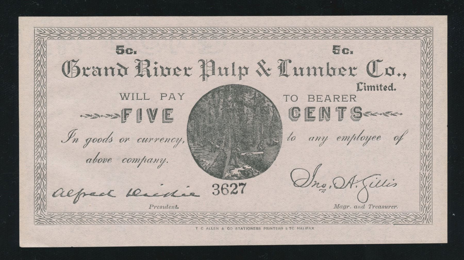 Undated circa 1900. The first of five pieces of uniface fractional scrip from this rare Newfoundland issuer. Printed by T.C. Allen & Co. of Halifax with each denomination having its own color and sharing the same lumber cutting vignette. AU/Unc. S/N: 3627.
