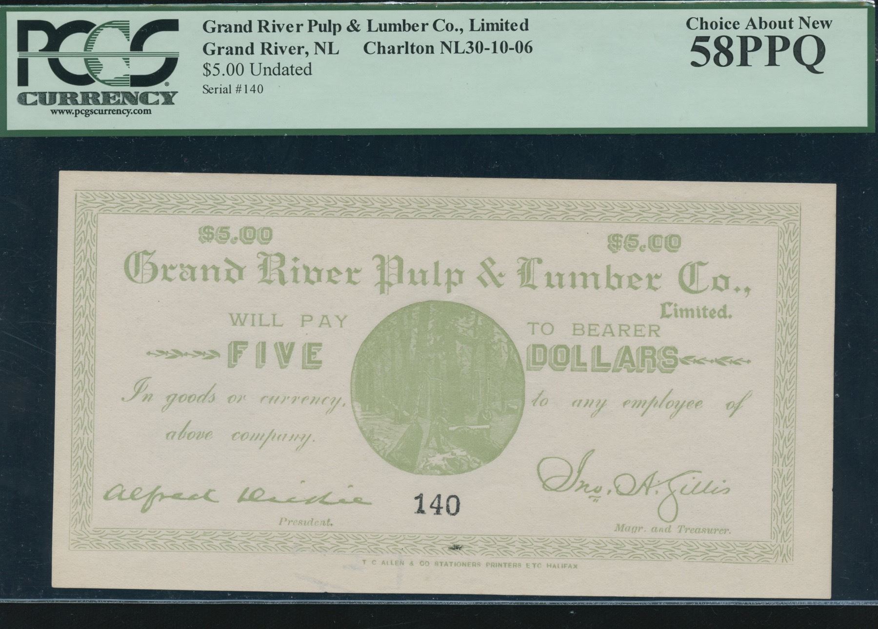 Undated circa 1900. The last of the five pieces of uniface fractional scrip from this rare Newfoundland issuer. Printed by T.C. Allen & Co. of Halifax with each denomination having its own color and sharing the same lumber cutting vignette. PCGS AU58 PPQ. S/N: 140.