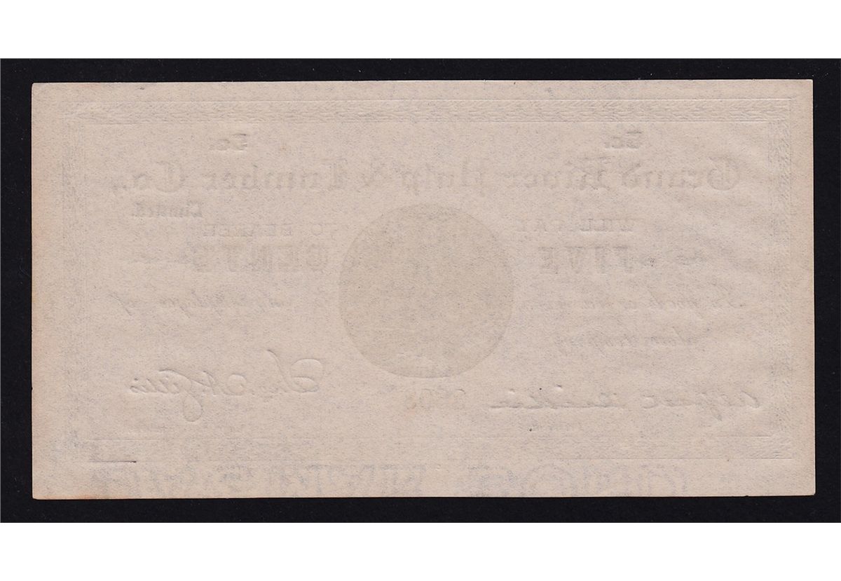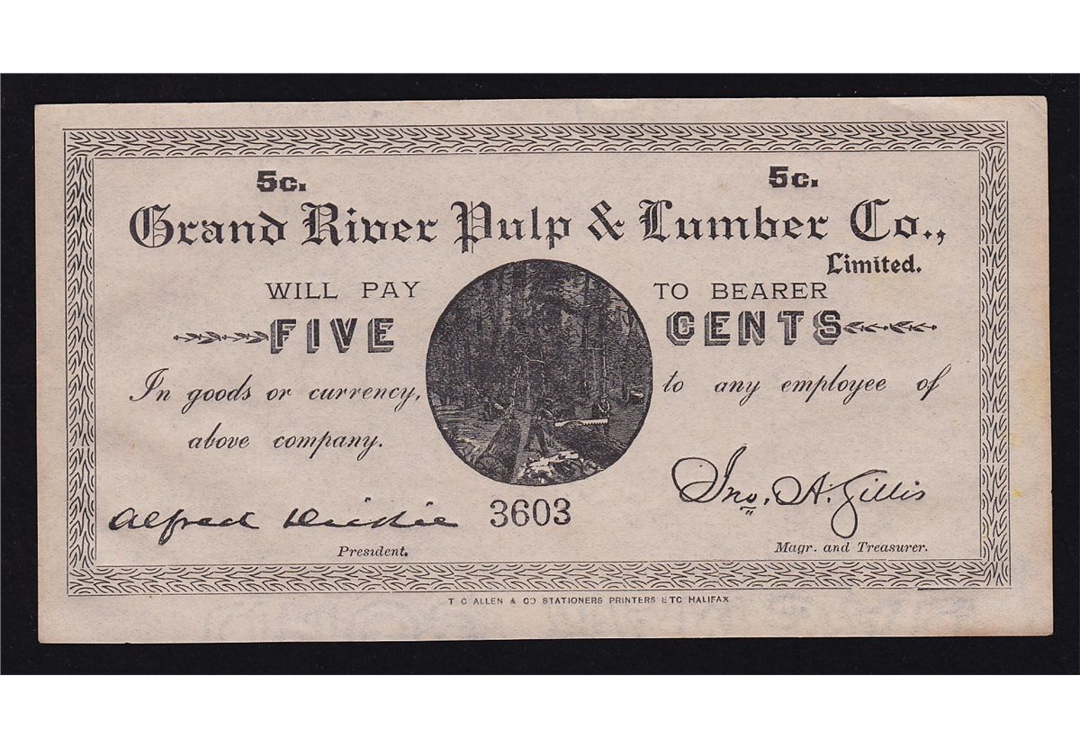 Grand River, Newfoundland Pulp & Lumber Company 5 Cent - CH UNL, this run of Newfoundland Scrip is listed in Charlton Canadian Merchant Scrip. Rare and seldom offered. This piece was printed by T.C. Allen & Co. of Halifax. Each denomination has its own color and share the same lumber vignette. This 5 cent piece is AU. S/N:3603.