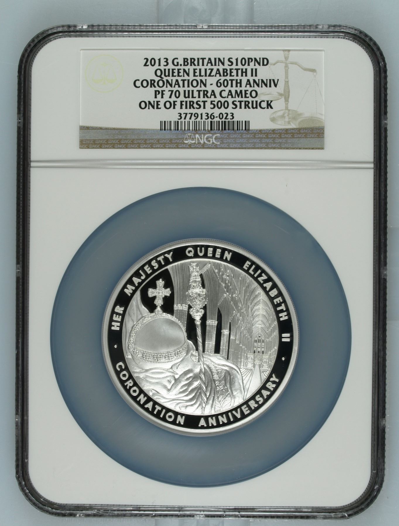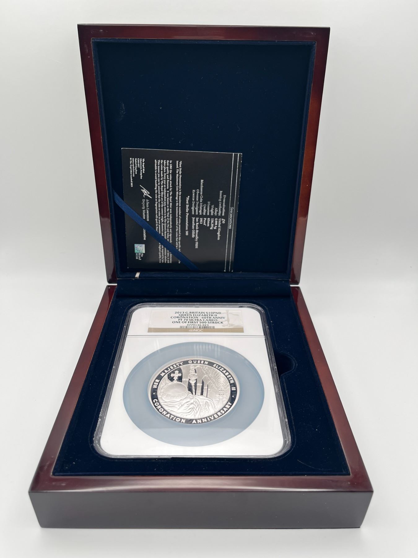 LOW NUMBER #6 - This coin is part of the first 500 coins struck, and this one is #6. Made of five ounces of .999 silver to Proof standard. 2013-dated £10 coin to commemorate the 60th anniversary of Her Late Majesty Queen Elizabeth II’s coronation. NGC graded PF70 Ultra Cameo. In box wooden box with COA.