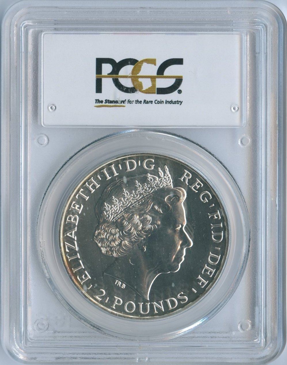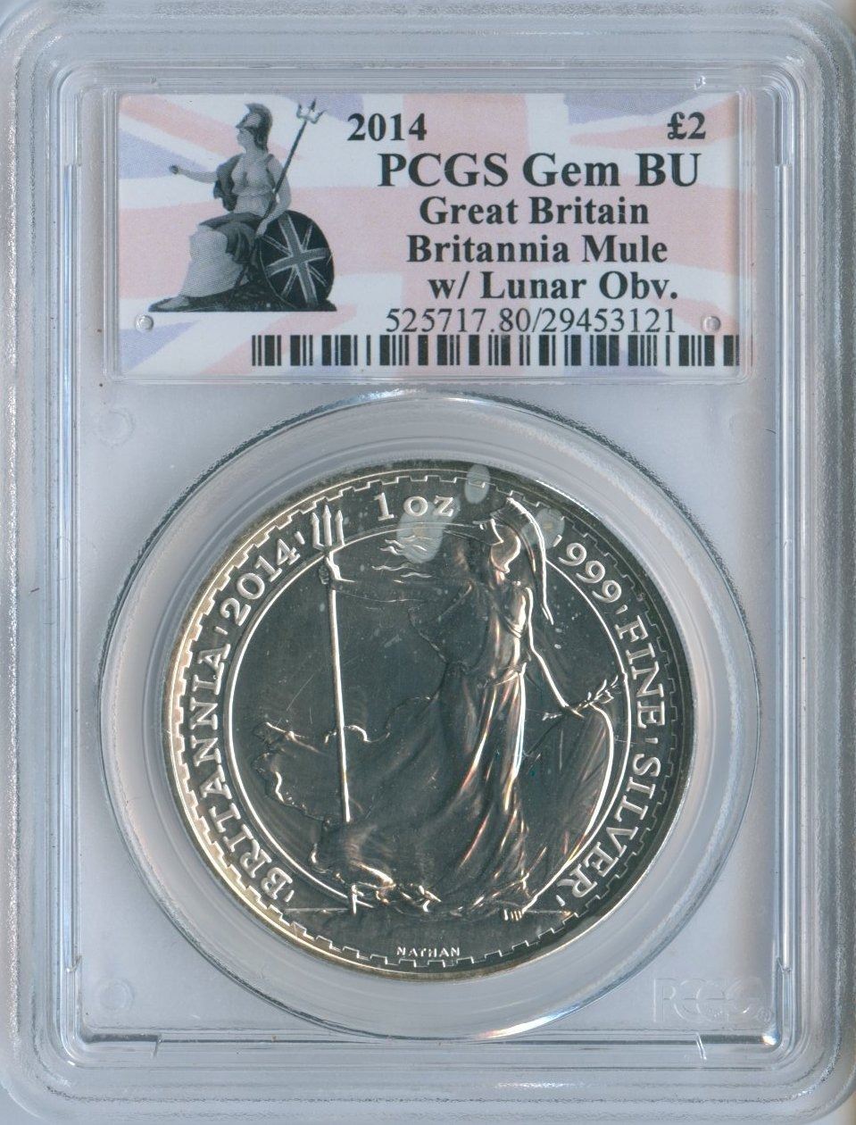 NGC GEM BU. This 1-ounce silver £2 coin was struck with an obverse die intended for the Royal Mint’s inaugural Lunar bullion issue.