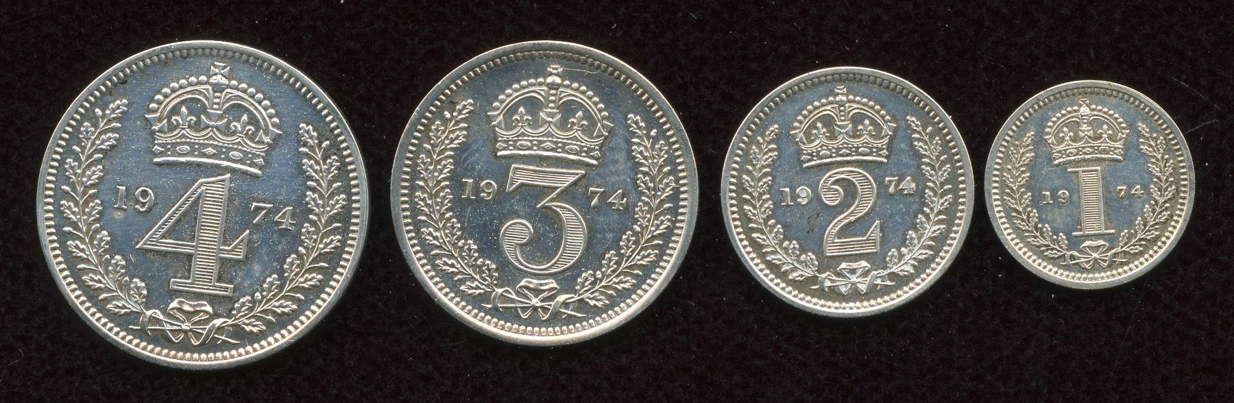 AR Maundy Set. Dated 1974. All coins (4): Bare head left / Crowned denomination mark within wreath. EF. 4 Pcs.